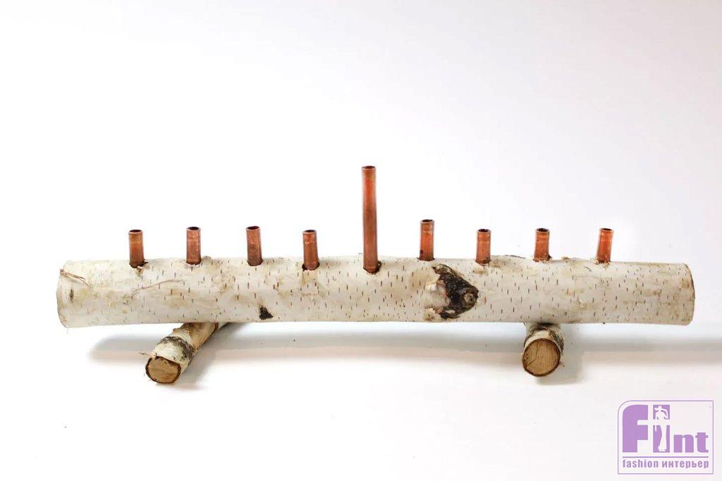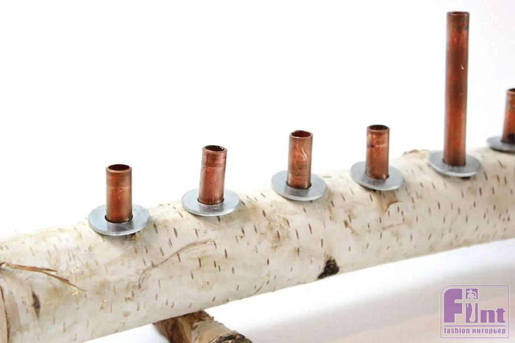 Вставьте 9 отрезков медной трубки в просверленные отверстия. Единственный длинный отрезок трубки установите по центру.Медные детали должны плотно прилегать к отверстиям.Если отверстия будут немного больше диаметра трубки, их можно «уплотнить» любым клеем, перед тем, как вставлять трубки в отверстия. Если же трубки будут чуть толще, их можно аккуратно забить в ветку, используя молоток.