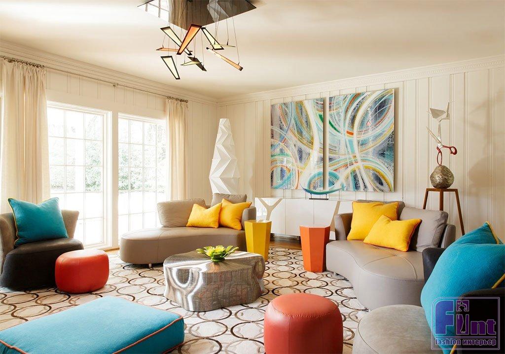 Разбавить нейтральную цветовую гамму интерьера помогут правильно подобранные аксессуары. Самый действенный способ — это, пожалуй, постеры и картины. Они моментально преображают интерьер, в отличие от более мелких деталей. При этом больших вложений не требуется, можно выставить в рамке рисунки вашего ребенка. Как правило, детские картины насыщены яркими красками и несут очень позитивный посыл. Дизайнеры любят использовать в декоре личные фотографии и другие изображения заказчиков. Это гарантирует достижение сразу двух целей: в интерьере появляется яркий арт-объект, и в дизайн интерьера включается личный душевный компонент.