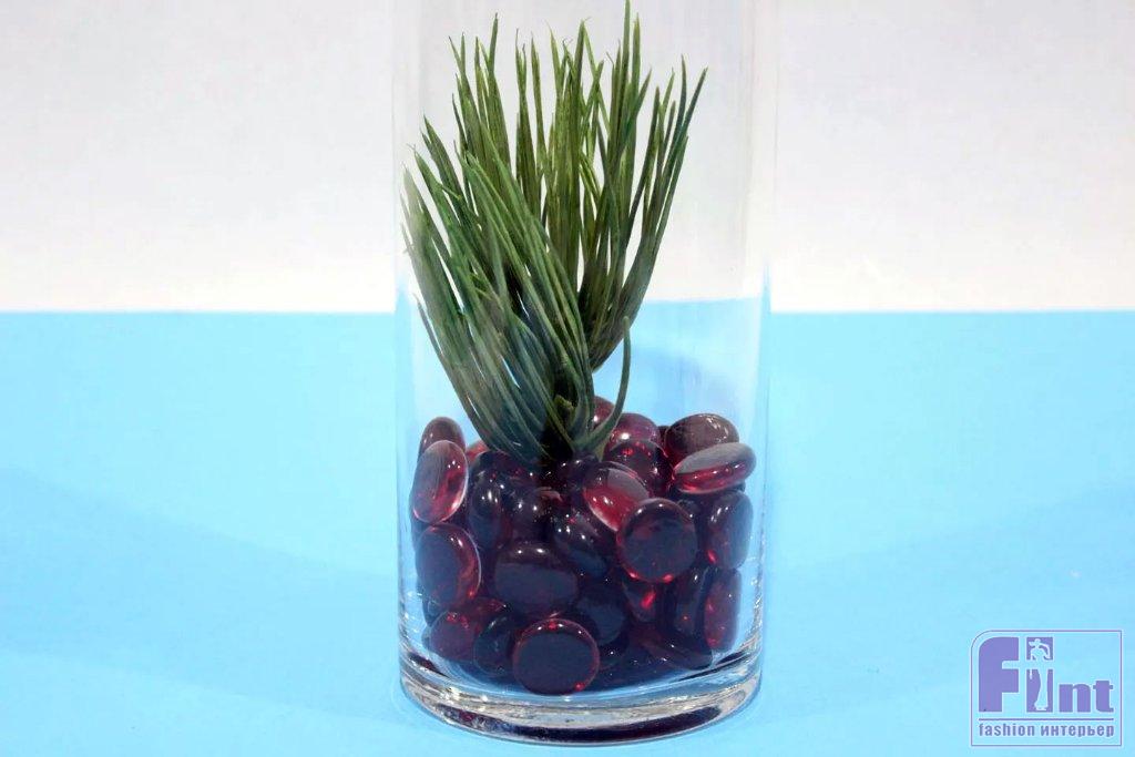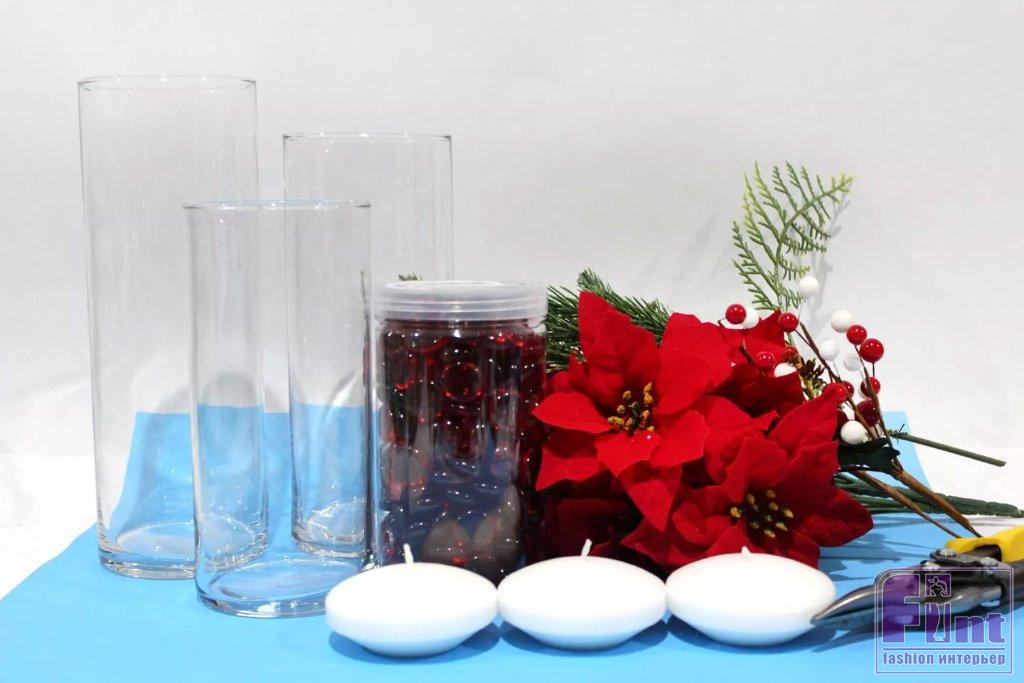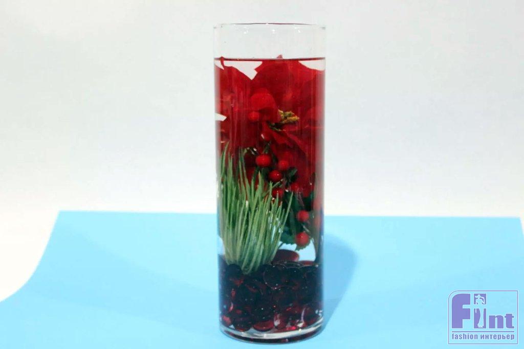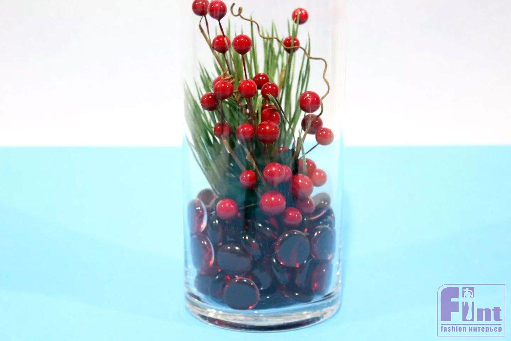 Поместите стеклянные бусины на дно каждого стакана, заполнив их примерно на 2 – 2,5 см. Укладывайте бусины осторожно и следите, чтобы стеклянные бусины не упали на дно и не повредили стакан. Стеклянные бусины в этом мастер-классе используются не только для декоративных целей. Они добавляют вес к стаканам, чтобы высокие «подсвечники» не опрокидывались. Бусины также обеспечивают место для фиксации цветочных стеблей и еловых веточек.