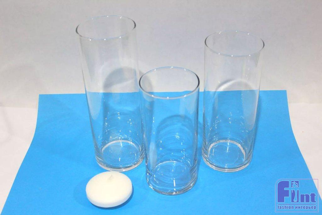 Чтобы создать композицию из плавающих свечей, вам понадобятся три цилиндрических стеклянных стакана разной высоты. В нашем случае мы использовали стаканы высотой 20 см, 22 см и 25 см. Диаметры стаканов должны быть немного больше, чем диаметр свечей-таблеток. У нас стаканы имеют внутренний диаметр 5 см, а свечки – 4,5 см.