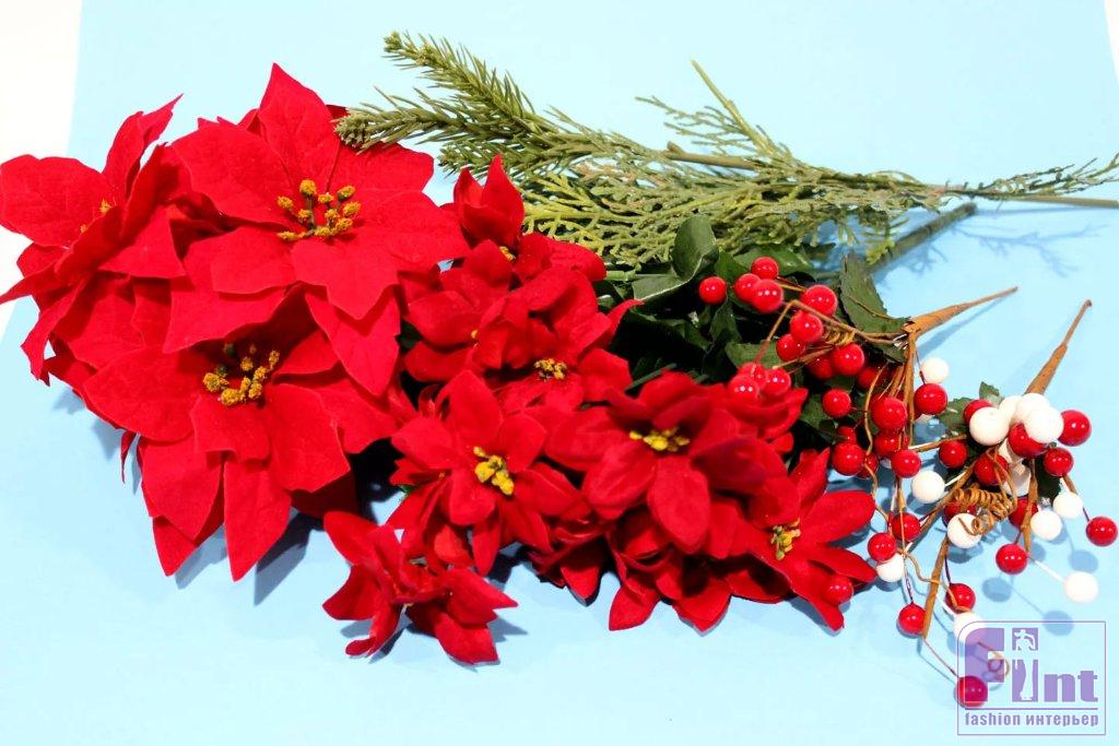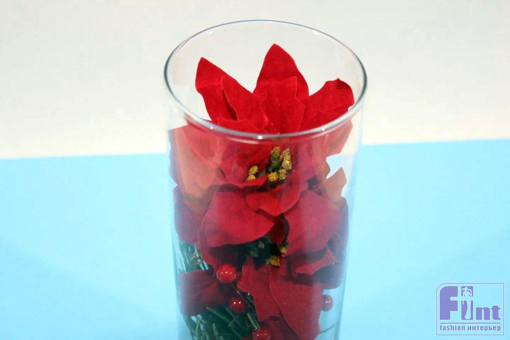 Главное решение, которое нужно принять в отношении цветов и веточек хвои, использовать ли свежие или искусственные растения. Свежие цветы хороши до тех пор, пока лепестки будут сохранять свою естественную форму в воде. Однако свежие цветы начинают портиться в воде почти сразу, поэтому они подходят, если свечки вы делаете для одного праздничного вечера или мероприятия, которое пройдёт в тот же день, когда вы делаете свечи. Мы выбрали искусственные цветы и веточки, потому что они остаются в первозданном виде даже при длительном нахождении в воде. Избегайте искусственных цветов, украшенных блёстками или искусственным снегом, так как эти элементы оторвутся и загрязнят воду. Мы также выбрали монохроматическую цветовую палитру ярко-красного цвета, характерную для рождественского или новогоднего декора, но использовали разные размеры и текстуры.
