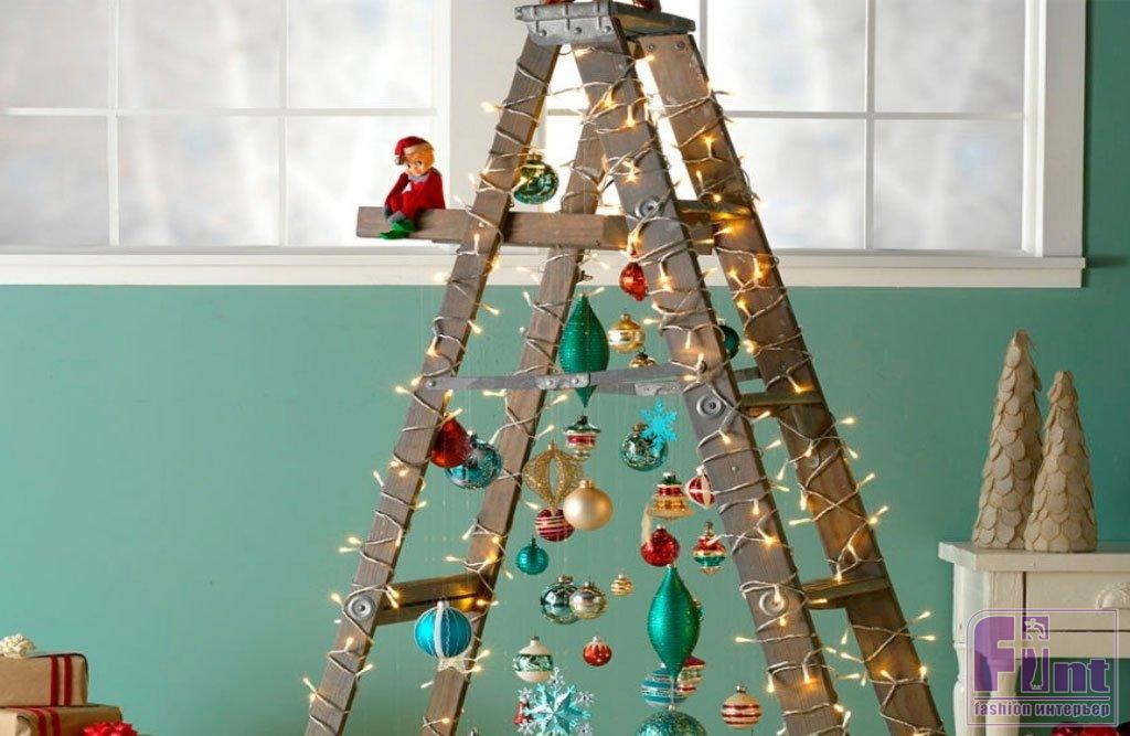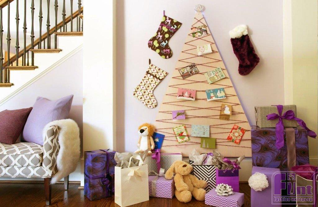 Стильно и интересно выглядят самые различные праздничные композиции на стенах. Дизайнеры и декораторы со всего света предлагают свои идеи, как оформить комнату к Новому году без ёлки. Так как Новый год нельзя представить без елки, сделайте её имитацию на стене с помощью гирлянд, дождика, игрушек и других элементов декора. Выглядит очень красиво и интересно.