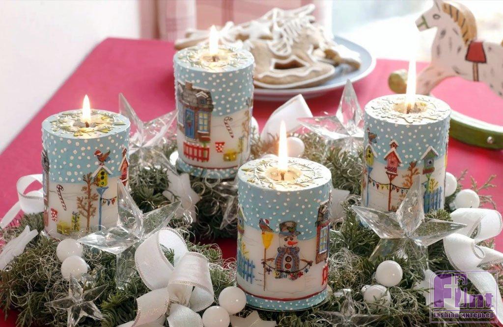 Расставьте свечи в новогодних подсвечниках, которые вы можете сделать сами. Пусть они красиво стоят на тумбочках, подоконниках, обеденном столе. Также вместо них вы можете использовать стилизованные новогодние светильники. Важно помнить, что горящие свечи не стоит оставлять без присмотра, поскольку открытое пламя может стать источником возгорания.