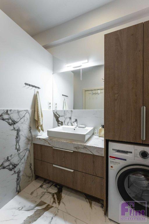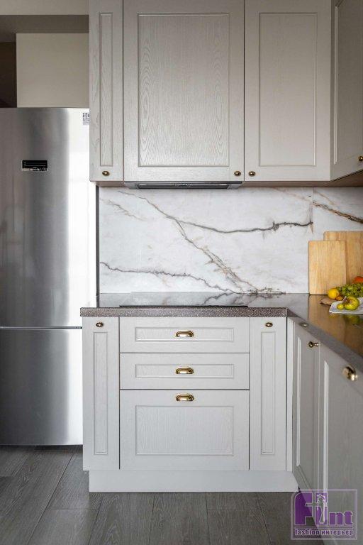 Гарнитур сделан на заказ в специализированной мастерской. Духовой шкаф вынесли в пенал, предусмотрели встроенную электрическую плиту и посудомоечную машину. Холодильник идеально встал в существующую нишу, образованную несущей стеной и вентиляционным каналом. Из особенностей кухни: в боковой части нижних шкафов расположили открытые полки, которые играют декоративную роль. С фронтальной части их не видно, они задекорированы фальшпанелью.