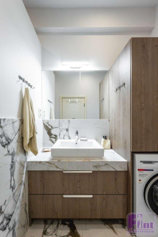 Особенностью почти всех новостроек в Крыму является готовая стяжка пола. Также в квартире были выставлены перегородки между кухней и спальней. Заказчики хотели сохранить и улучшить существующую планировку, чтобы минимизировать временные и финансовые затраты. «Проект реализовывался полностью с онлайн-надзором. Все отделочные материалы и мебель мы привезли из Москвы грузовой машиной. Зато встроенную мебель мы всю делали под заказ по эскизам у местных столяров. Результат понравился», — рассказывает дизайнер.
