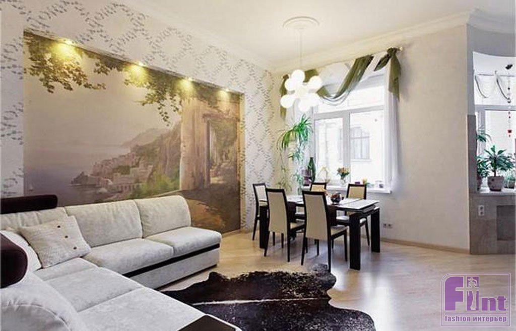Уютная гостиная отделена от обеденной зоны с помощью напольного покрытия. Пол кухни облицован кафелем итальянского производства, а пол обеденной зоны — паркетом из натуральной древесины. Важное место в комнате занимает стол, вмещающий много гостей. Мягкий диван белого цвета располагается в зоне отдыха. Там семья любит собираться по вечерам и смотреть любимые сериалы. Яркой особенностью гостиной является большая фреска с изображением моря, которая была сделана специально по заказу Ольги.