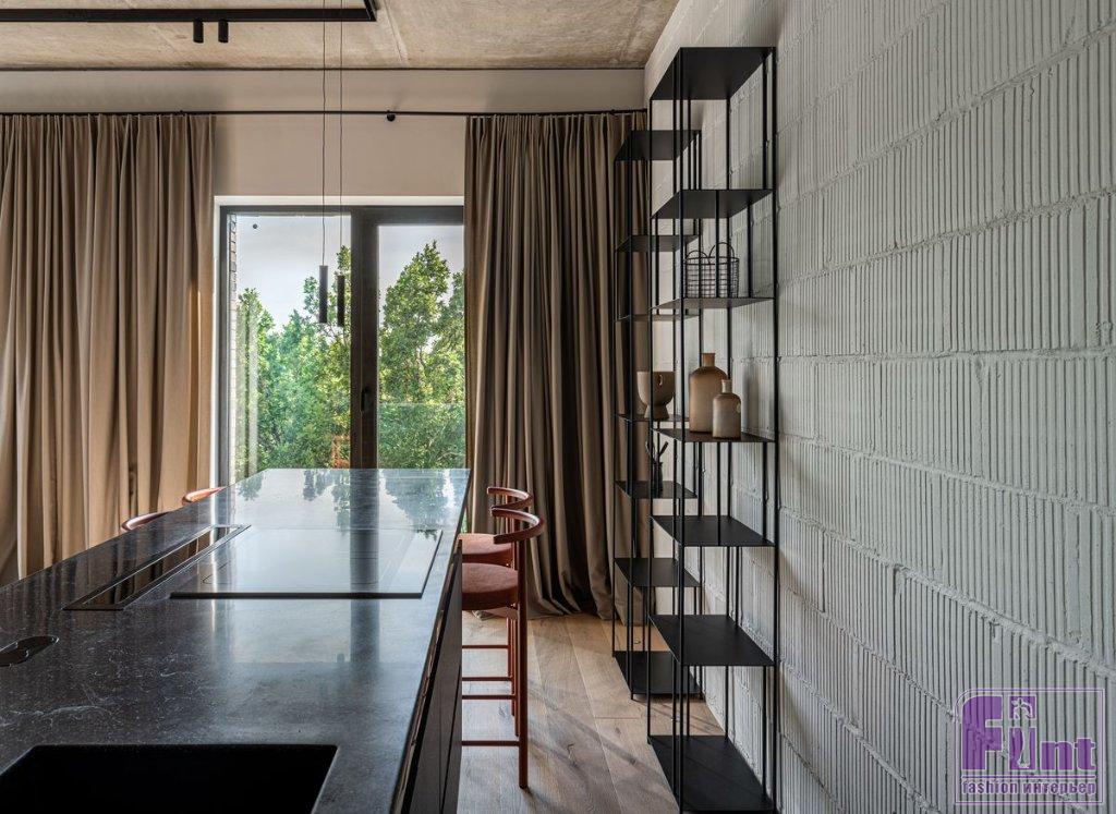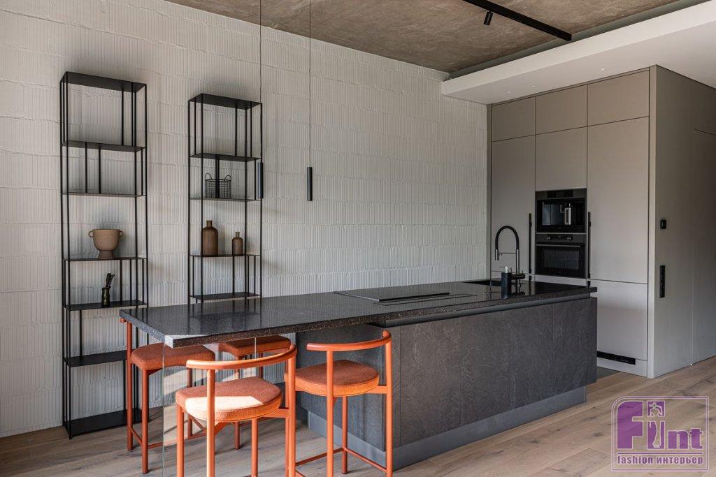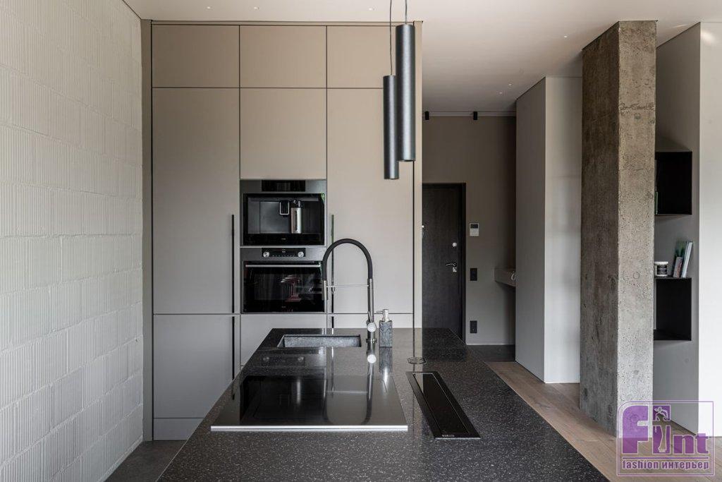 Кухонный «остров» привлекает внимание необычной текстурой фасадов, напоминающей камень. И это не случайно, поскольку это модель выполнена в цвете «сланец графит». Она изготовлена из ДСП, покрытой текстурированным пластиком HPL, который очень реалистично воспроизводит натуральные материалы. Чтобы не отвлекать внимание от красоты фасадов, от накладных ручек отказались в пользу трендового профиля, который выполняет функции ручек. Кухонный гарнитур в виде колонн с фасадами цвета «шелк бежевый» дополнили минималистичный интерьер кухонного пространства. Фасады гарнитура изготовлены из МДФ, покрытой термопластиком. Дверцы украшают широкие черные ручки от известной итальянской компании, специализирующейся на мебельной фурнитуре.