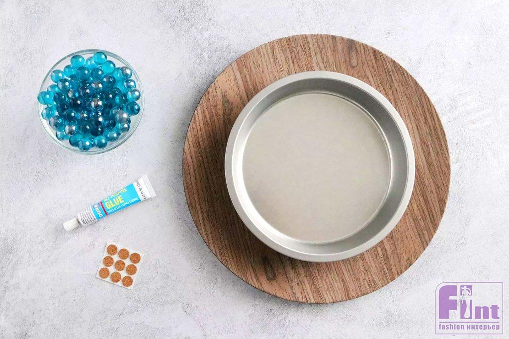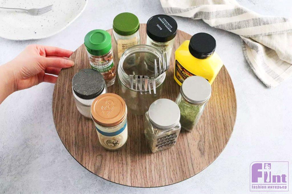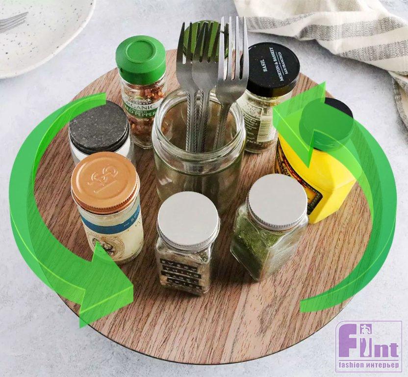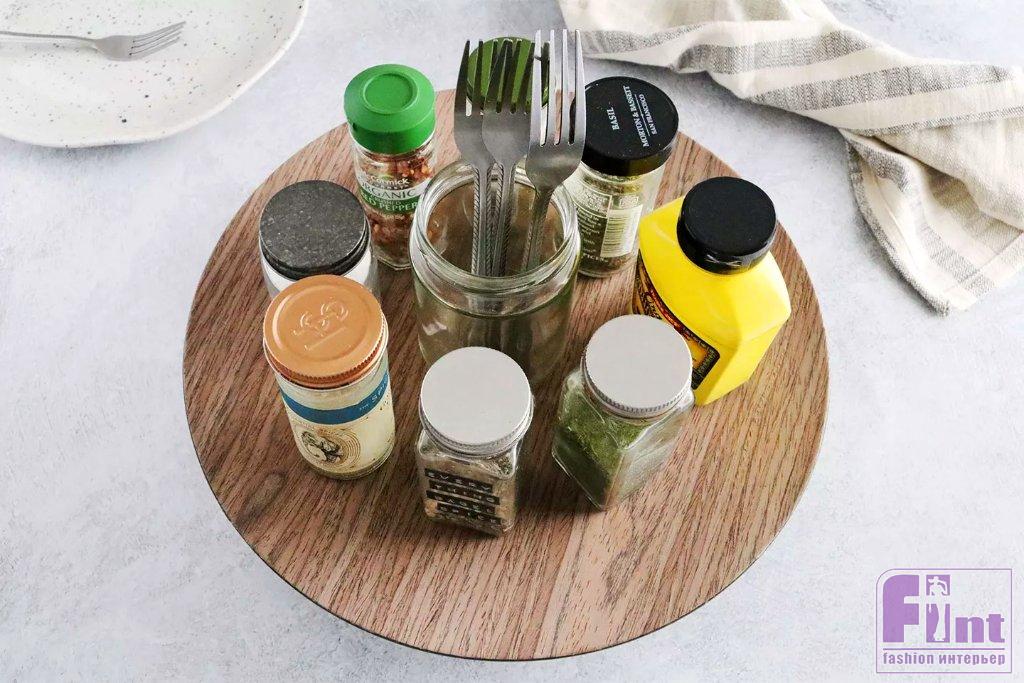 Конечно, это всего лишь один из способов создать удобный вращающийся столик-подставку. Чтобы сделать компактную версию этого изделия, вы можете просто установить вторую форму для торта в первую поверх насыпанных шариков. Такой вариант подставки идеально подходит для организации хранения предметов в кухонном шкафу или кладовой, хотя вы также можете использовать ее в качестве настольного аксессуара, хотя его декоративный вид будет не такой шикарный, как с использованием деревянной разделочной доски.