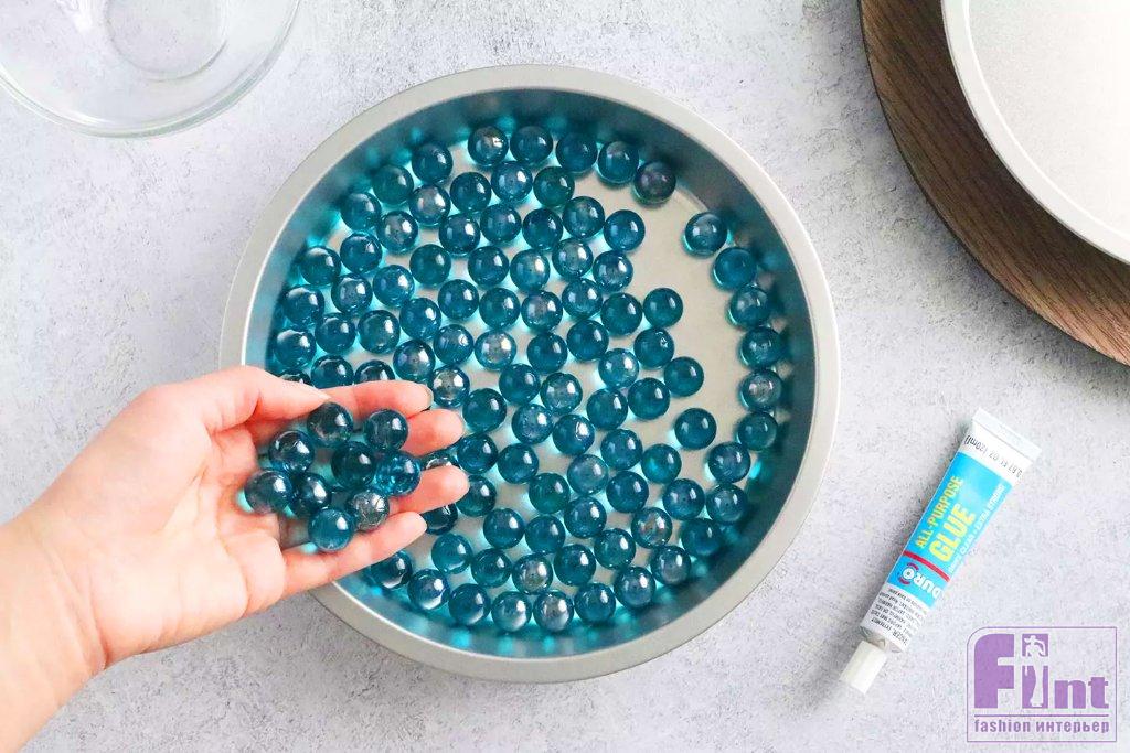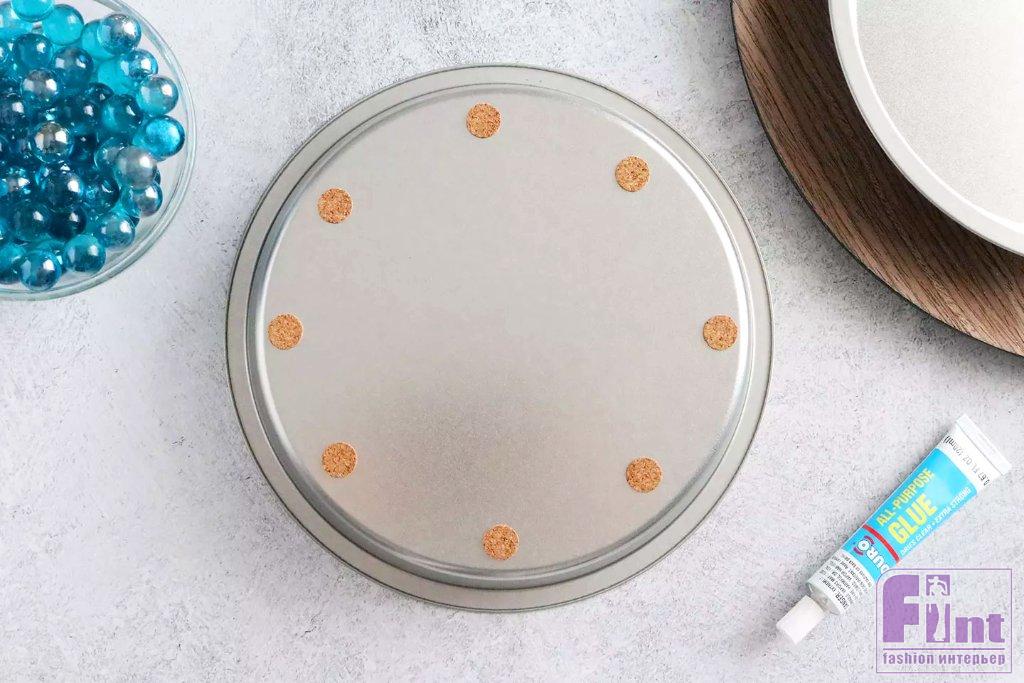 Переверните форму для торта с наклеенными прокладками и насыпьте в неё стеклянные шарики ровным слоем. Диаметр шариков должен быть меньше высоты бортиков формы. Этот слой стеклянных шариков будет работать как подшипник и поможет подставке крутиться вокруг своей оси. Отставьте форму с шариками в сторону. Точное количество шариков будет зависеть от размера вашей формы для торта.