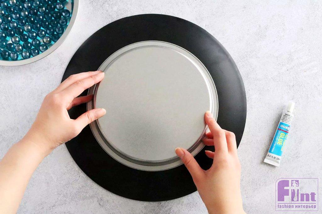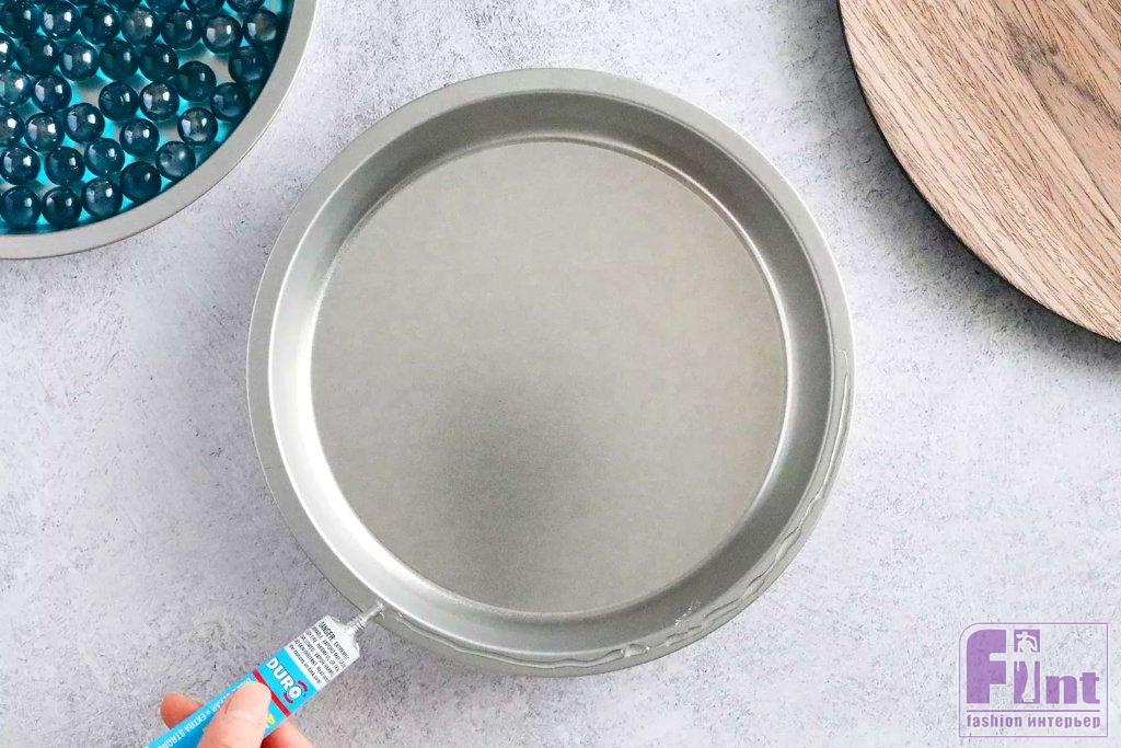 Приклейте круглую разделочную доску или любой её деревянный или пластиковый аналог к форме для торта. Постарайтесь поместить детали строго по центру, ориентируясь на выступающие части разделочной доски. Если вы не уверены в своём глазомере, можно предварительно приложить форму к доске, промерить расстояния до краёв доски и очертить контур места будущего крепления формы к доске. Плотно прижмите детали, чтобы надёжно их склеить, а затем отложите заготовку. Дайте клею полностью высохнуть.