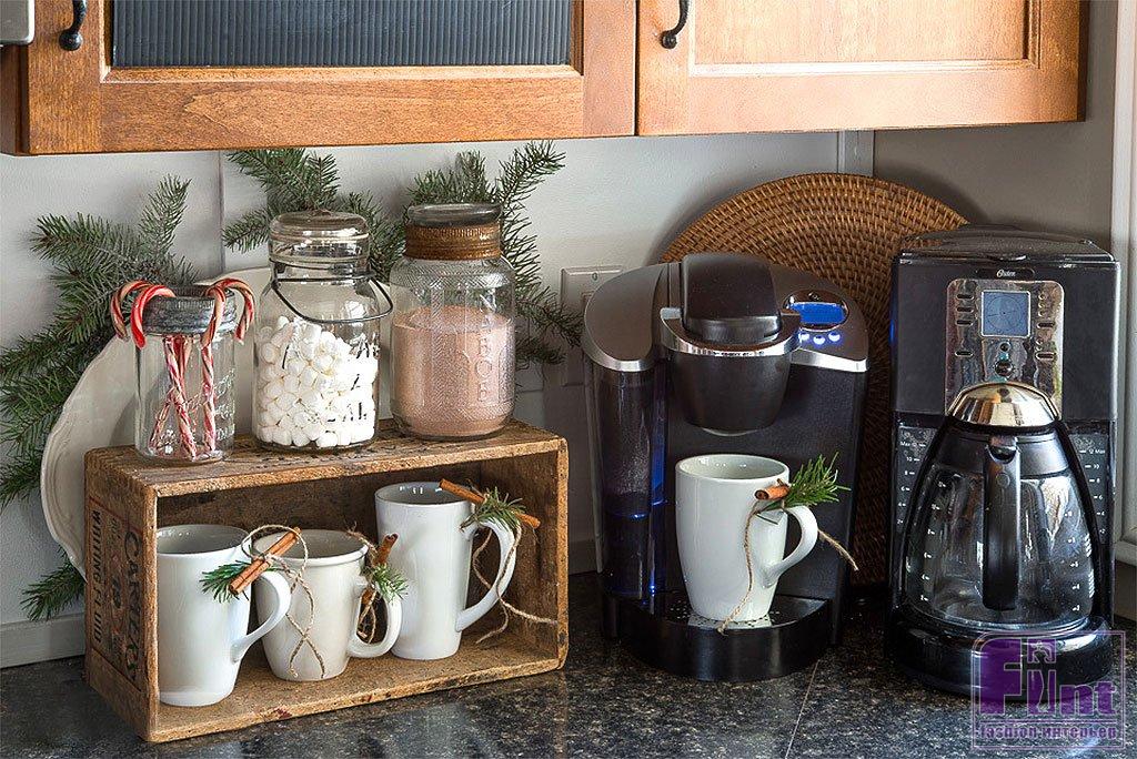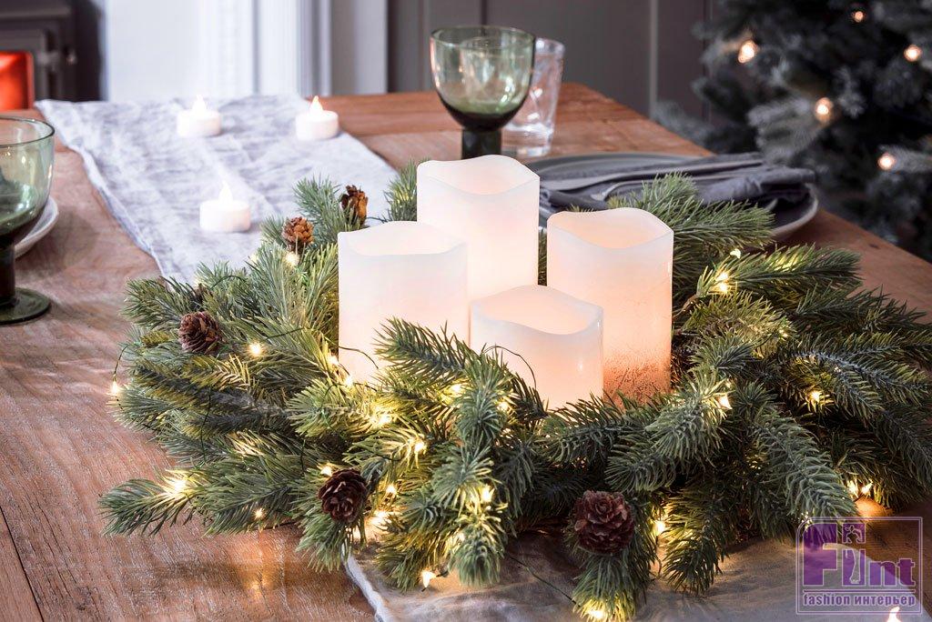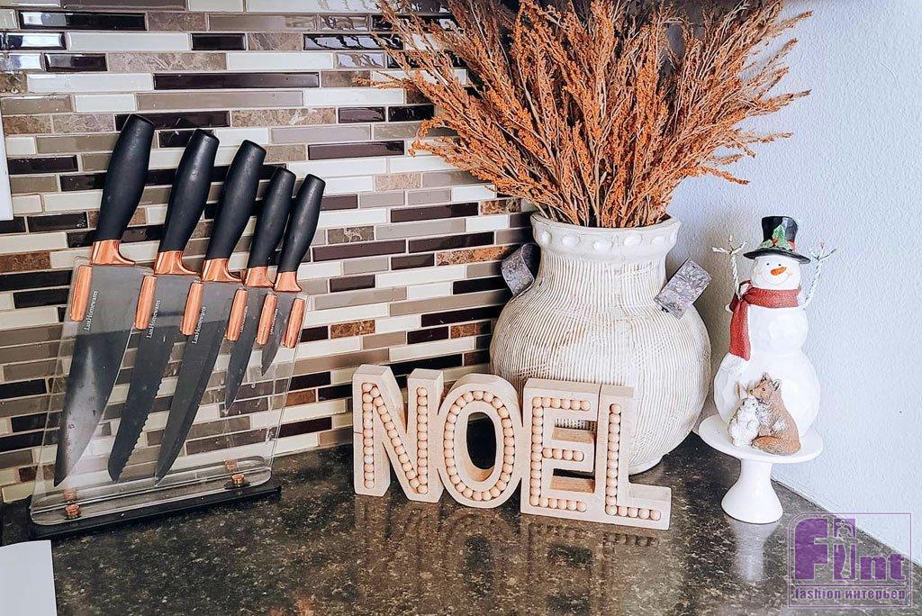 Если на кухонной столешнице есть свободное место, задекорируйте его. Поставьте милую фигурку снеговика или тематическую надпись. Интересно выглядят светодиодные декорации: например, домики с горящими окнами или декоративные свечи. При выборе декора для рабочей поверхности кухни ориентируйтесь не только на красоту, но и на практичность материала. Столешница регулярно контактирует с едой, поэтому на украшениях могут остаться пятна. Некоторые изделия не выдержат соседства с мойкой или плитой.