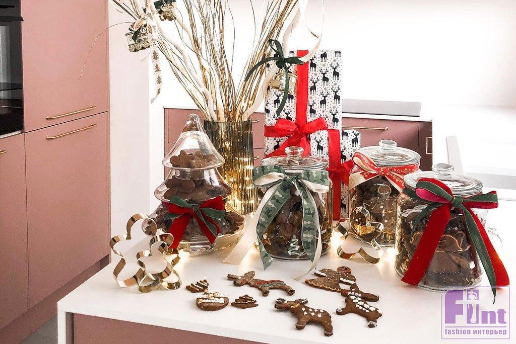 Бюджетный и быстрый способ расставить яркие акценты на кухне — обвязать банки и бутылки красивыми ленточками. Украшенную таким образом посуду поставьте на видное место и используйте как полноценный декор. Интерьер сразу же станет более нарядным, а вы сэкономите на покупке дорогостоящего декора. Особенно колоритно выглядят банки, наполненные традиционным для зимы имбирным печеньем.