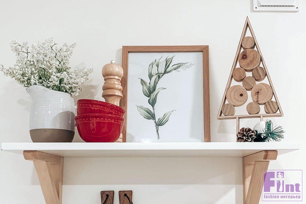 Хвойные деревья прочно ассоциируются с зимой, поэтому смело используйте их в интерьере в любых проявлениях. Небольшую новогоднюю ёлочку украсьте гирляндой или игрушками, а дерево без декора подойдёт для обычных зимних дней. Образ ёлки можно обыграть по-разному: поставить фигурку, похожую на живое дерево, или создать лишь намёк с помощью декоративного панно из спилов. И тот, и другой вариант отлично подойдёт для украшения кухни зимой.