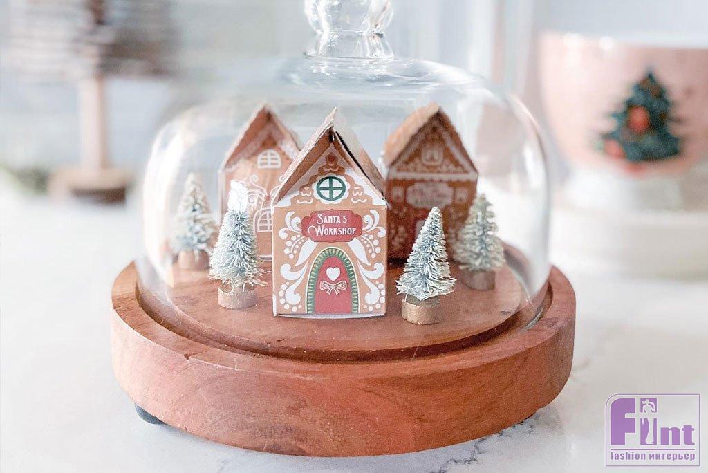 Красивую композицию с зимним сюжетом можно организовать в тортовнице. Стеклянный колпак защитит детали от пыли и грязи. В качестве наполнения подойдут заснеженные ёлки, домики и светодиодная гирлянда. Поставить такую композицию можно прямо на обеденном столе, по желанию — дополнительно украсить столешницу или открытые полки.