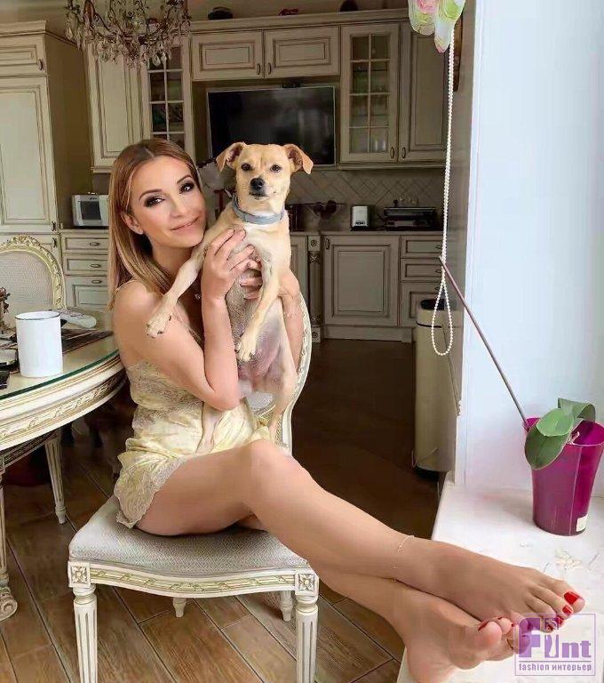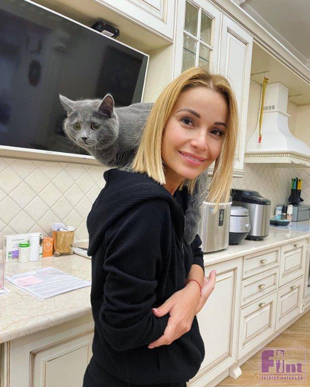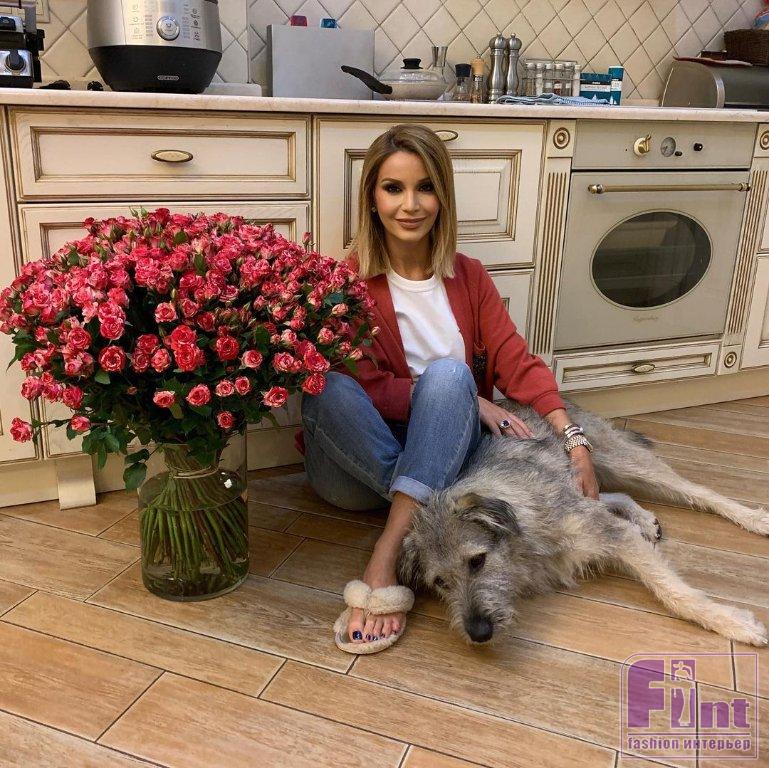 Кухня и столовая певицы и телеведущей совмещены и обставлены в стиле прованс: белая плитка на стенах, светлая мебель (белая с бежевым). На стене между шкафчиков располагается большой плазменный телевизор. Возле окна стоит круглый стол со стеклянной столешницей, в летнее время на окнах размещаются шторы с нежными пионами, а зимой они уступают место тяжёлым тёплым портьерам.