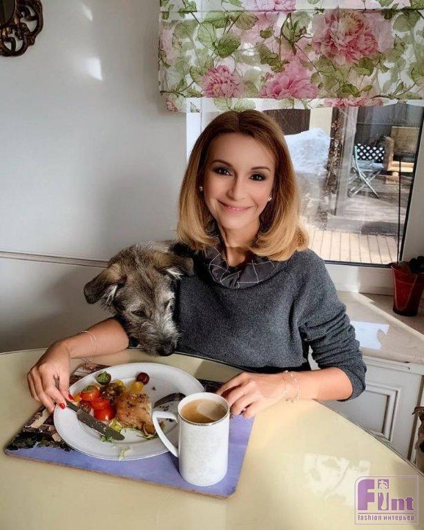 Кухня и столовая певицы и телеведущей совмещены и обставлены в стиле прованс: белая плитка на стенах, светлая мебель (белая с бежевым). На стене между шкафчиков располагается большой плазменный телевизор. Возле окна стоит круглый стол со стеклянной столешницей, в летнее время на окнах размещаются шторы с нежными пионами, а зимой они уступают место тяжёлым тёплым портьерам.