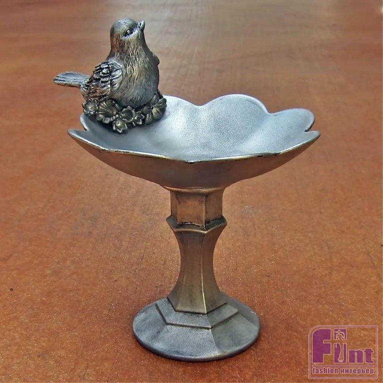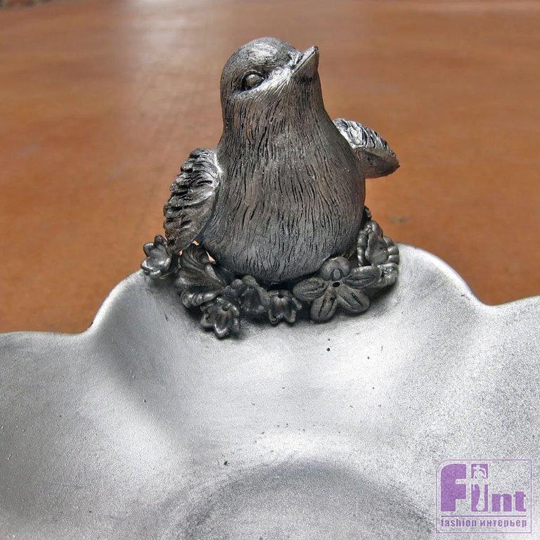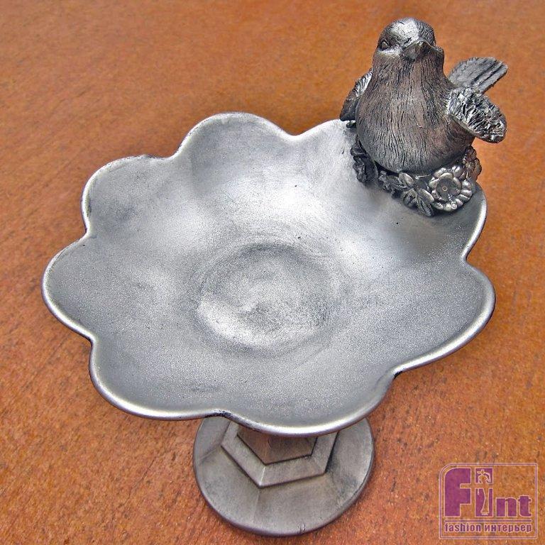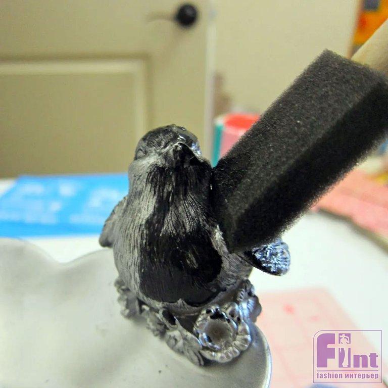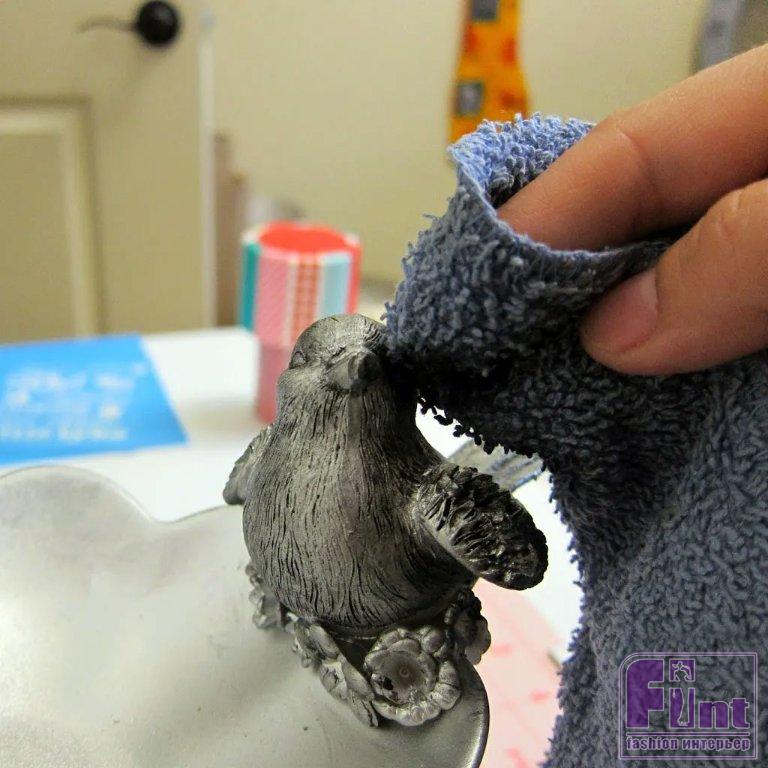 Не дожидаясь высыхания, аккуратно сотрите излишки краски сухой мягкой тряпкой. Не наносите чёрную краску на большие площади изделия, чтобы она не успевала сохнуть. Работайте небольшими участками. Если вы допустили ошибку, просто добавьте ещё краски, а затем снова сотрите её. Повторите этот процесс, пока вся чаша не будет состарена, включая птичку, саму чашу и её ножку.