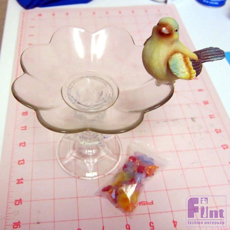 При необходимости, подготовьте игрушечную птичку для приклеивания к стеклянной вазочке. Если у птички есть ножки, срежьте их ножом так, чтобы птичка «сидела» на краю вазочки всем телом. Затем, используя клей E-6000 или любой подходящий универсальный мгновенный клей, который найдётся в вашем доме, приклейте птичку на край вазочки.
