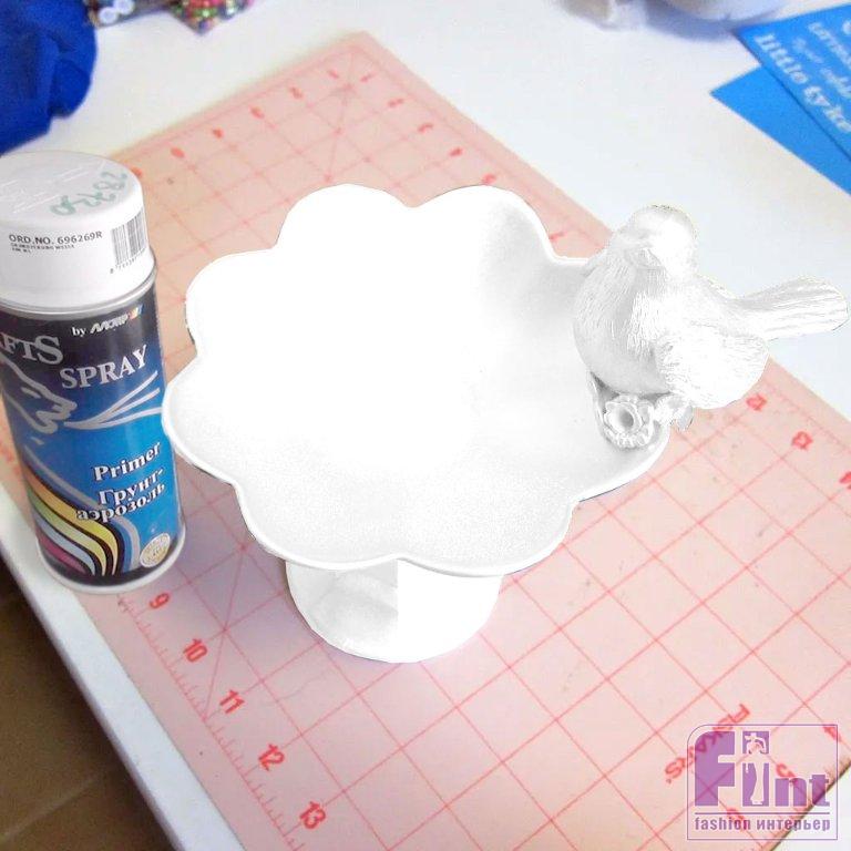 После того как клей высохнет, закройте место приклеивания птички пластиковыми цветочками, которые часто используются в детских наборах по плетению браслетов. Такие же цветочки можно найти в магазинах, торгующих материалами для бисероплетения. Наклеиваем цветочки в произвольном порядке, используя тот же клей, что и для птички. Дайте клею полностью высохнуть и загрунтуйте изделие аэрозольной акриловой краской белого цвета. Такой грунтовочный слой поможет нам получить идеальный оттенок металлизированной краски «под серебро». Работайте с краской только в хорошо проветриваемых помещениях или на открытом воздухе!