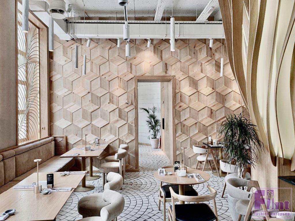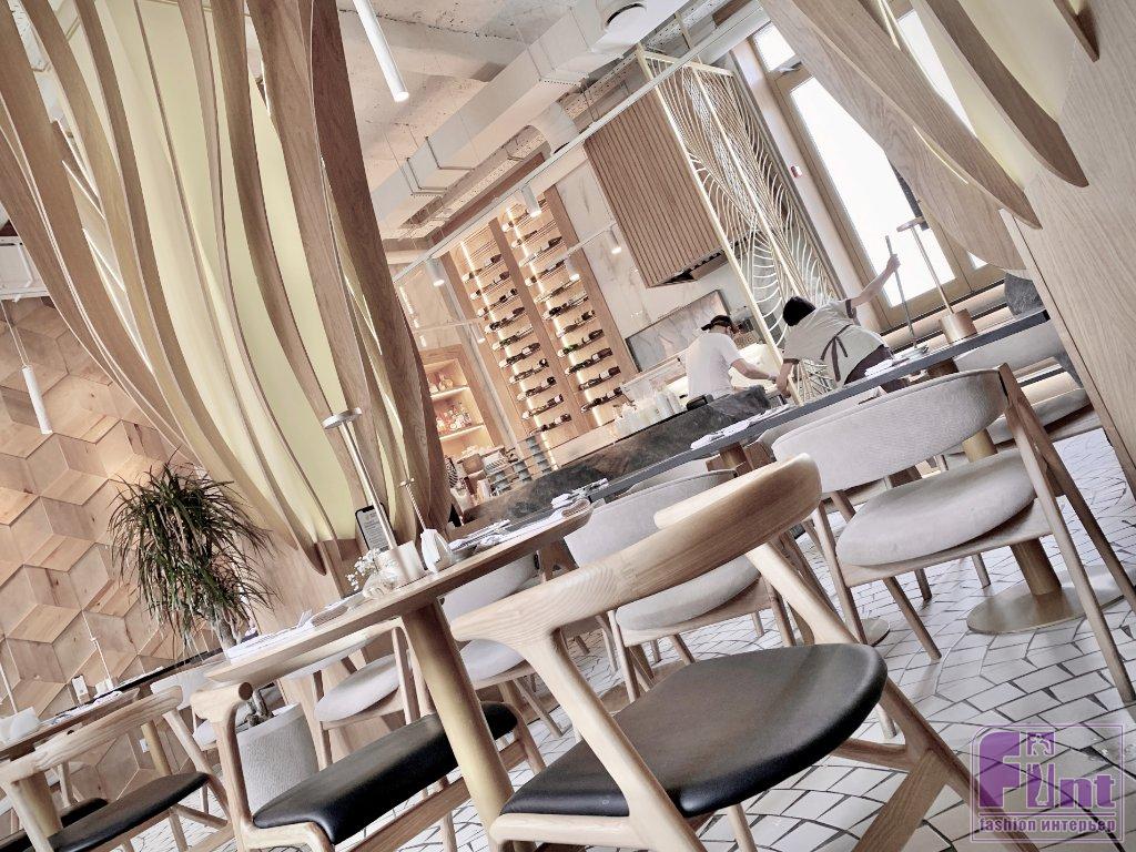 Светлый и лёгкий интерьер, где дизайнер уделил большее внимание и отдал предпочтение фактурам и текстурам, настоящему и натуральному, действительно располагает к себе с первого взгляда. Это место, где авторская подача блюд тесно дружит с интерьером бистро, тонко и изящно дополняя друг друга. Именно таким выглядит бистро Хариzма. Пастельная бархатная обивка стульев потрясающе сочетается со светлым натуральным деревом и квадратной кафельной плиткой на полу, выложенной причудливыми концентрическими узорами.