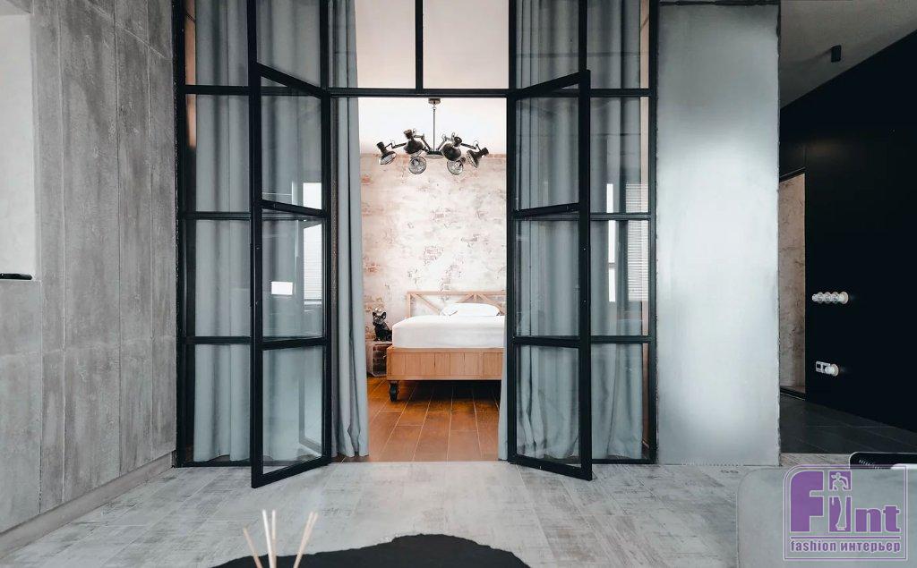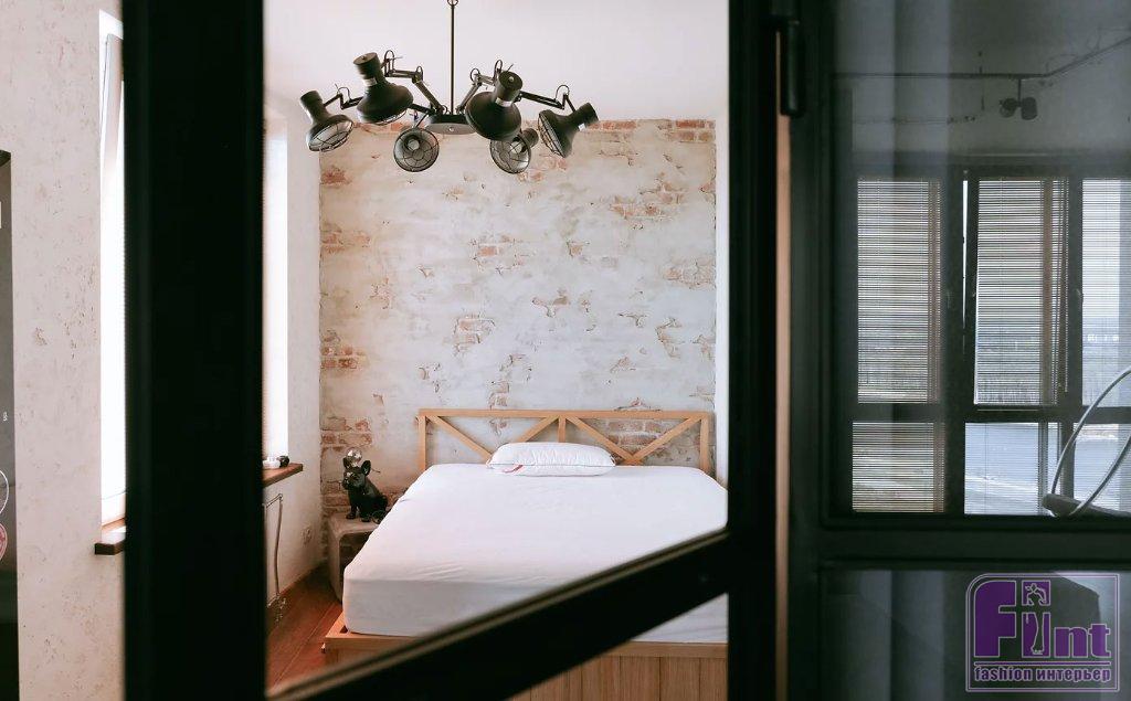 Спальню от гостиной отделяет лёгкая стеклянная перегородка, что добавляет пространству атмосферу «безграничности». В то же время дизайнер продумал функциональную штору из плотной ткани, которая одним движением превращает спальню в зону блэкаут. Кровать также выполнена по эскизам автора. При этом интерьер спальни немного отвлекает от урбанистических пейзажей за окном — он ориентирован на лес. Зимой хозяин восполняет силы, любуясь картиной зимнего леса.