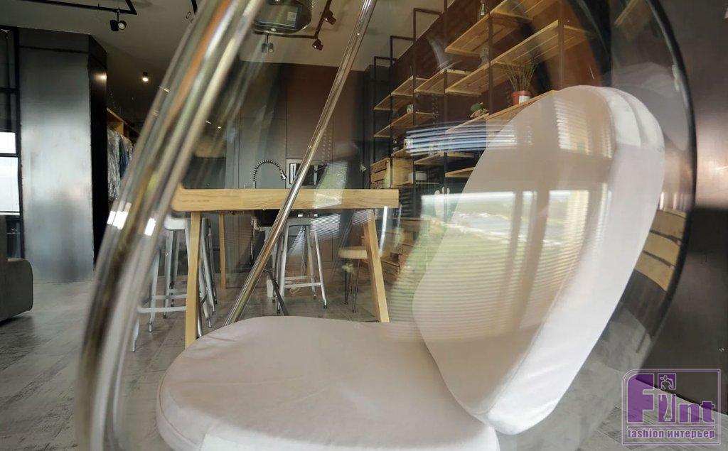 Интерьер имеет брутальный сильный характер благодаря тёмным цветам стен и мебели, бетону, кирпичу и натуральному дереву в отделке помещений. Все элементы этого интерьера говорят на языке промышленного стиля лофт. А лейтмотивом интерьера, в виде полунамёков, служит тема безграничного космоса. Квартира имеет двухстороннюю ориентацию. При входе взгляд устремляется на панораму города, которой хозяин теперь любуется по вечерам с бокалом вина в подвесном кресле на цепи. Как отмечает автор, контраст матовых чёрных поверхностей и подвесного кресла-пузыря подчёркивает эффект антигравитации. Мебель на ножках контрастирует с грубой отделкой стен из «тяжёлого» бетона. Холоднокатаная сталь в отделке колонн контрастирует с краснокирпичными стенами.