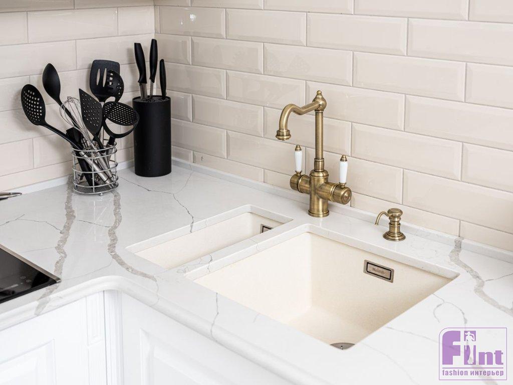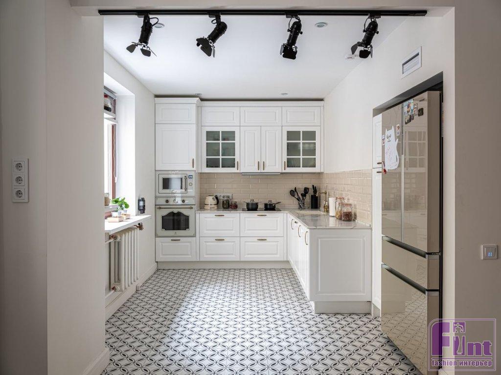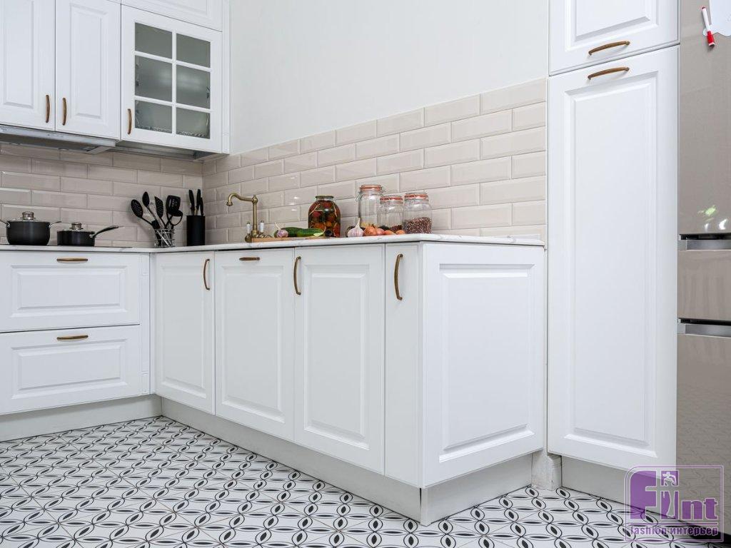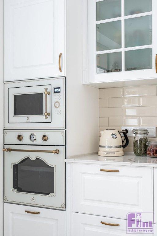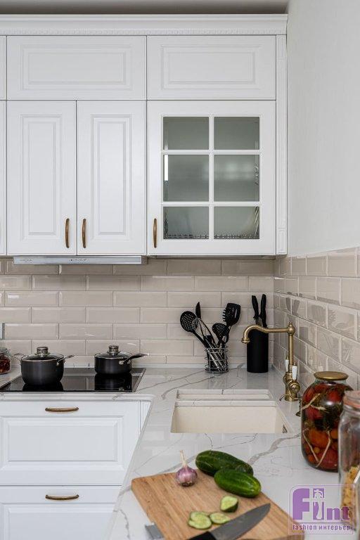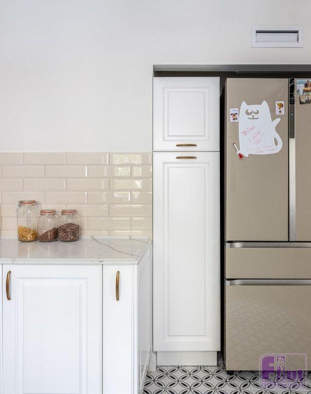 Чтобы кухня оставалась светлой и просторной, но при этом была вместительной, дизайнер Анатолий Самохвалов разместил высокие навесные секции под потолок на одной стороне, а стену напротив окна оставил вовсе без верхних шкафов. В нишу рядом с холодильником поместил небольшой функциональный пенал, оснащённый выдвижной колонной. Использован каждый сантиметр кухни, особенно Виктору понравилось, как обустроена секция с встраиваемой вытяжкой: «Дизайнеры тщательно проработали пространство. Всё очень удобно. Когда готовишь, все специи у тебя под рукой. Казалось бы, места немного, но всё решено с умом».