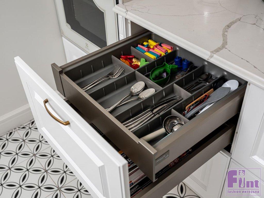 В семье Логинова любят и умеют готовить, поэтому кухня всегда заполнена продуктами, заготовками, специями, различной утварью и гаджетами. Организовать более удобное хранение позволяют механизмы: двухуровневая сушилка, выдвижная колонна и бутылочница от известной итальянской компании, вместительные и бесшумные ящики от немецкого производителя.