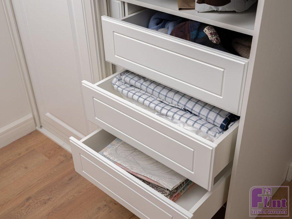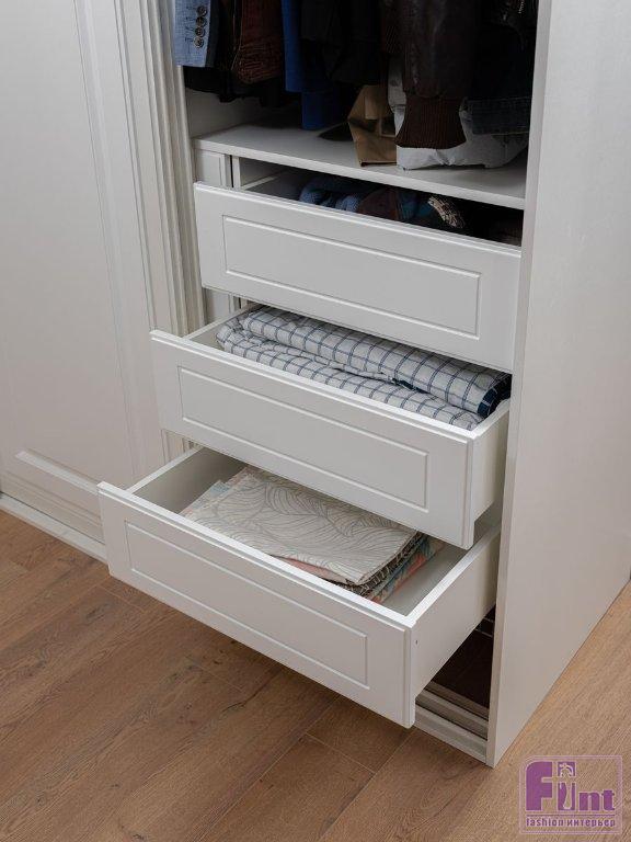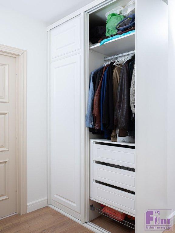 Приятным открытием для Виктора Логинова стало то, что компания, в которую он обратился, производит не только кухни, но и шкафы. Он заказал для своей квартиры сразу два белых шкафа, выполненных в одном стиле с кухней. Первый – шкаф-купе для хранения одежды, оснащенный корзиной для белья и полкой для обуви итальянского бренда. Второй – распашной. Он предназначен для хозяйственных нужд. Почётное место в нём занимают банки с соленьями, которыми семью снабжает бабушка любимой супруги Виктора.