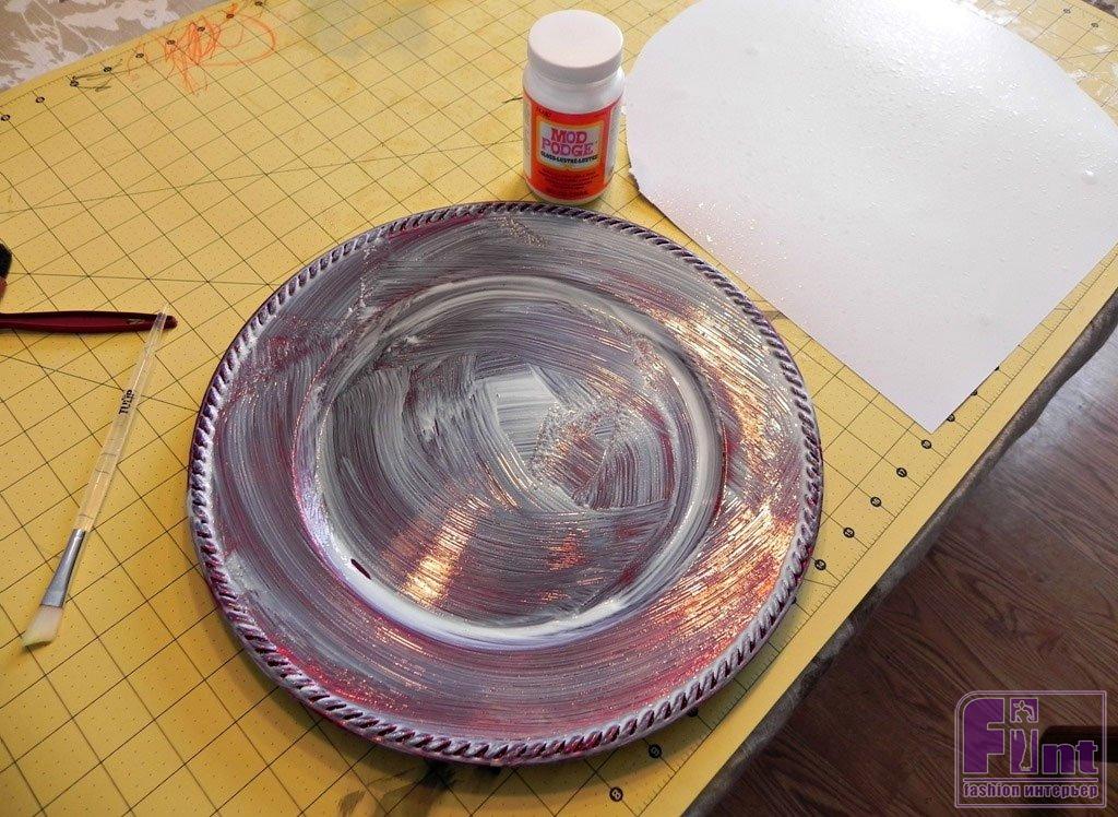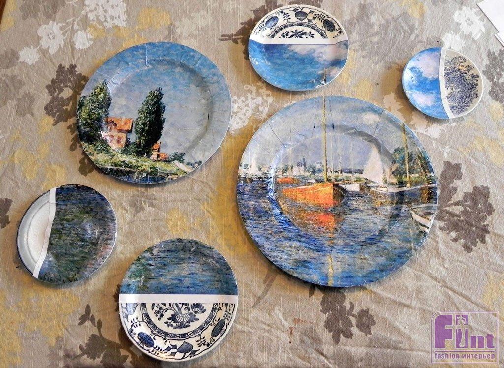 Переверните тарелку и, используя острый нож, отрежьте лишнюю часть фрагмента картины по контуру тарелки. Старайтесь, чтобы край тарелки также был плотно обтянут изображением. Покройте тарелку с изображением слоем клея-лака и оставьте сохнуть. Повторите процедуру с другими тарелками.