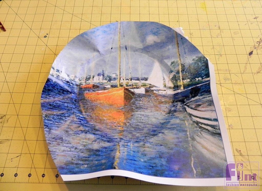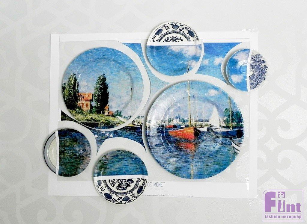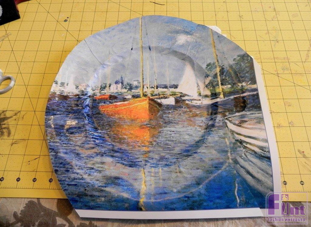 Поскольку тарелки имеют сферический изгиб поверхности, а бумага абсолютно плоская, для плотного прилегания вам необходимо будет сделать несколько радиусных разрезов. Сделайте прорез насколько это необходимо, слегка перекройте изображение и пригладьте его. Кстати, выбранная нами картина известного импрессиониста облегчает этот шаг, поскольку неровные и хаотичные мазки кисти художника маскируют наложения. Продолжайте разглаживать изображение, пока оно полностью не обтянет лицевую сторону тарелки.