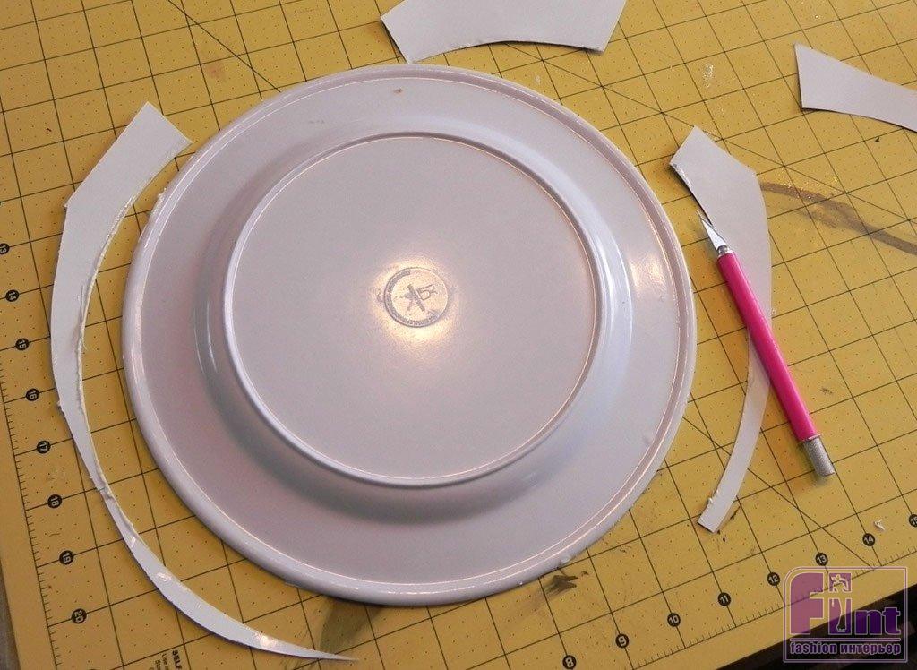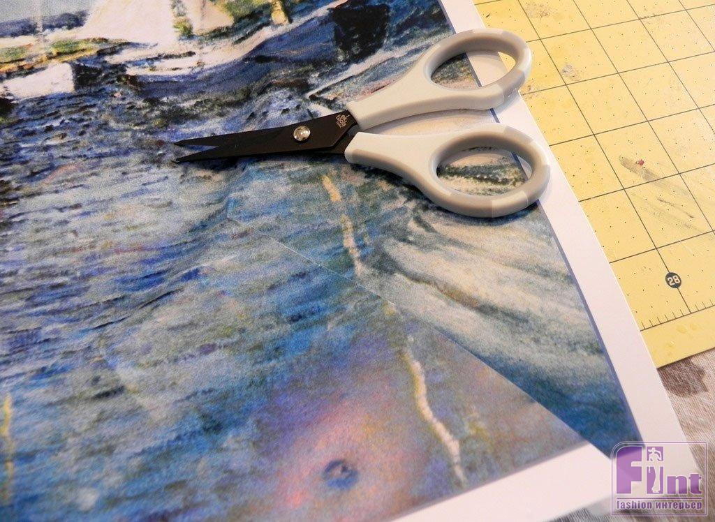 Используя острый нож вырежьте фрагменты картины по контуру тарелок, оставляя припуск примерно в 2,5 см, который необходим для загиба изображения на заднюю часть тарелки. Если ваш постер имеет белые поля, отрежьте их. Они понадобятся чуть позже.