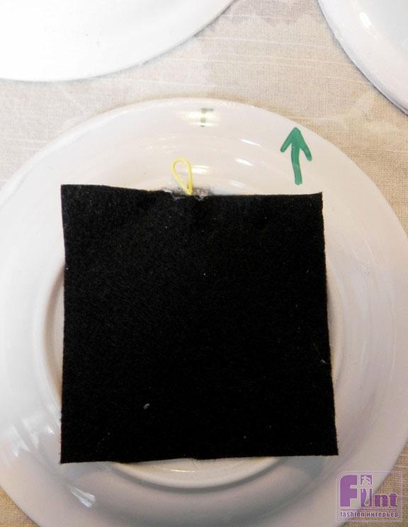 С помощью горячего клея приклейте петельки в верхней части тарелок и закройте их кусочками тонкого фетра. Такое решение поможет дополнительно укрепить петельку и не даст обратной стороне тарелок царапать стену.