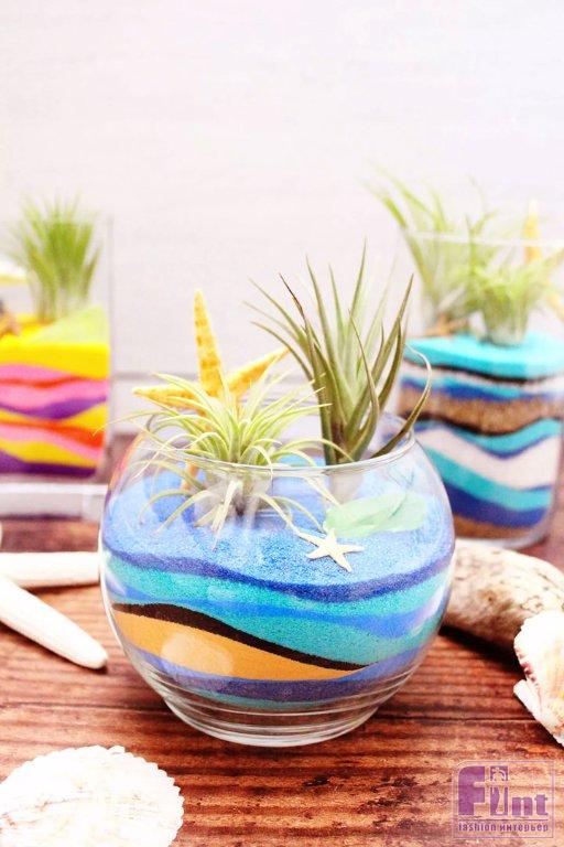 Эти террариумы представляют собой функциональные произведения искусства, которые прекрасно передают красоту песка и живой природы. Поэкспериментируйте с разными цветами песка или разными аксессуарами для украшения. К празднику 8 марта можно воткнуть в песок свечку в виде цифры «8»для торта.