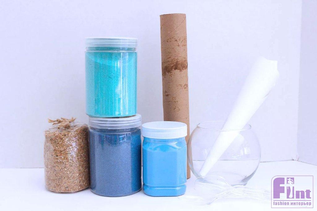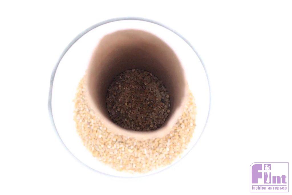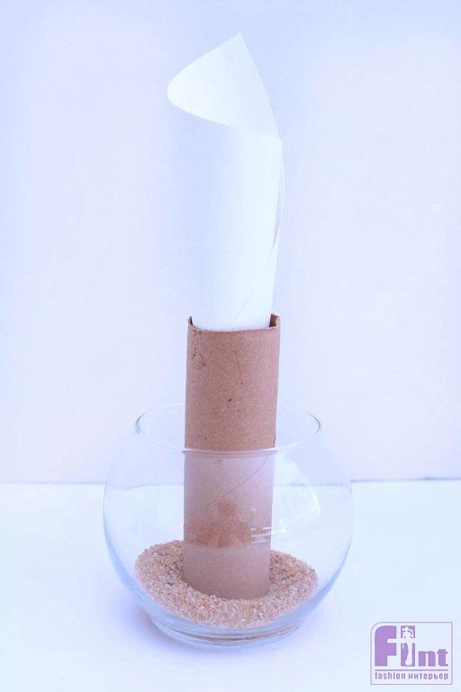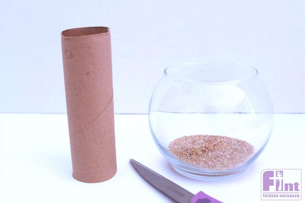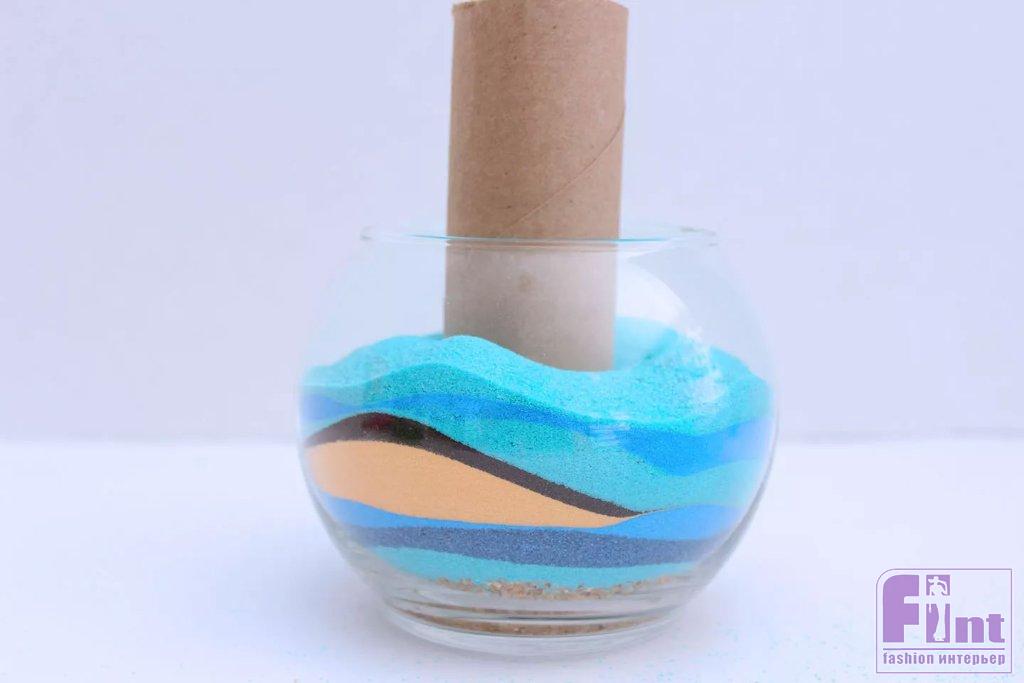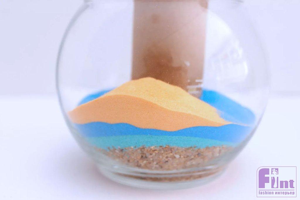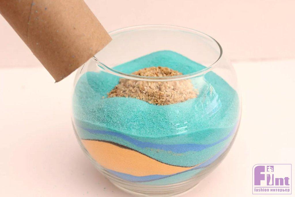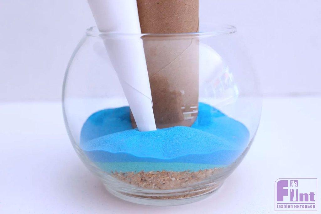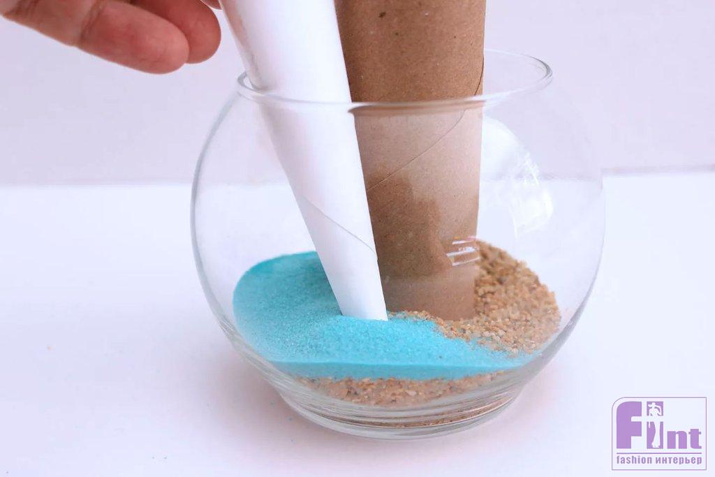 Насыпьте примерно 1 – 1,5 см обычного песка на дно сосуда. Основная цель этого базового слоя – помочь удержать картонную втулку от бумажного полотенца на следующем шаге.