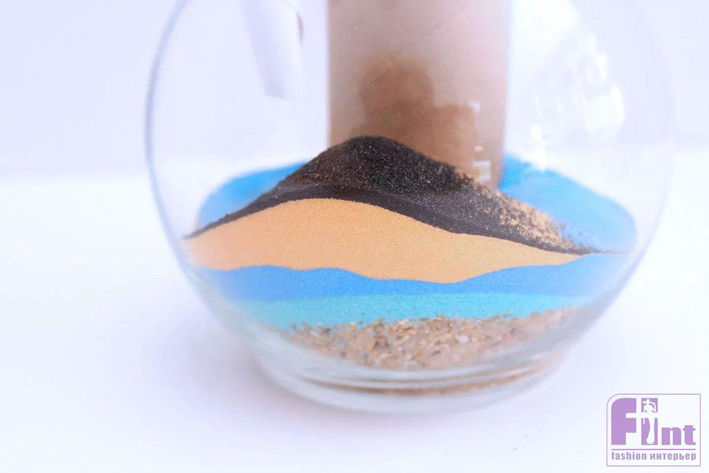 Чтобы остров выделялся, насыпьте тонкий слой тёмного песка поверх жёлтого, вновь используя воронку для направления потока песка.