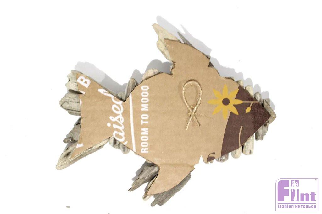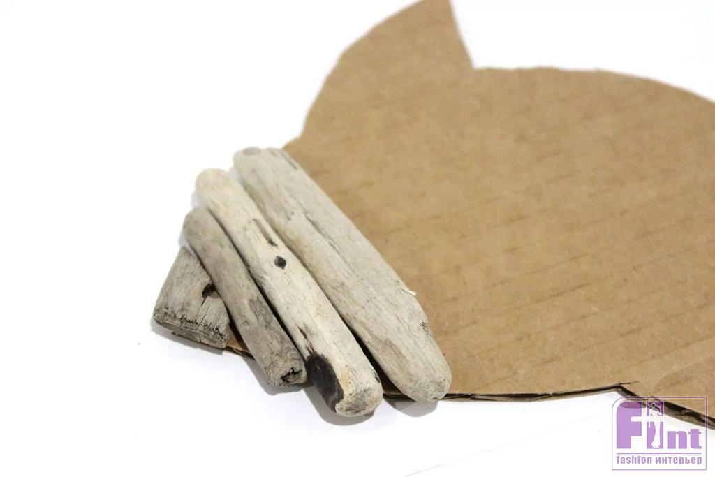 Вырежьте рыбу по контуру ножницами. Картон обеспечивает жесткую основу для панно, а светло-коричневый цвет обычного гофрокартона будет хорошо сочетаться с наклеенными на него кусочками дерева.