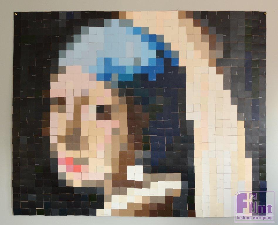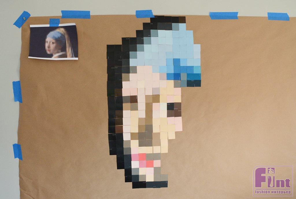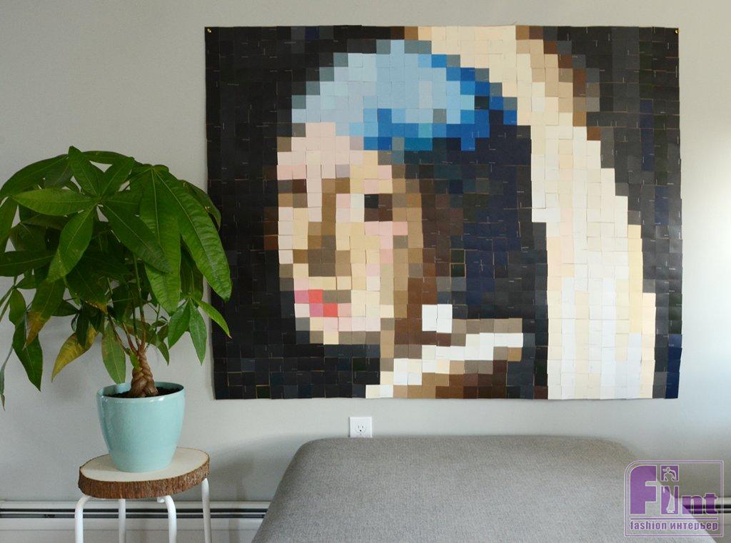 Не переживайте, если вы не смогли найти абсолютно точные цвета образцов, соответствующие цветам на картине. Достаточно, если они будут совпадать приблизительно. Безусловно, перенесение пиксельного рисунка на стену требует времени, внимательности и терпения, но это того стоит! Наклеив первую сотню листиков, отойдите от стены, немного прищурьтесь и, как по мановению волшебной палочки, вы увидите «Девушку с жемчужной серёжкой» в своём собственном исполнении!