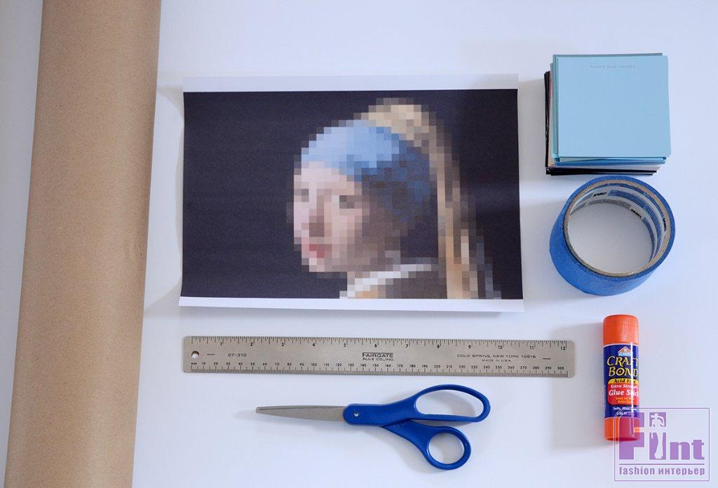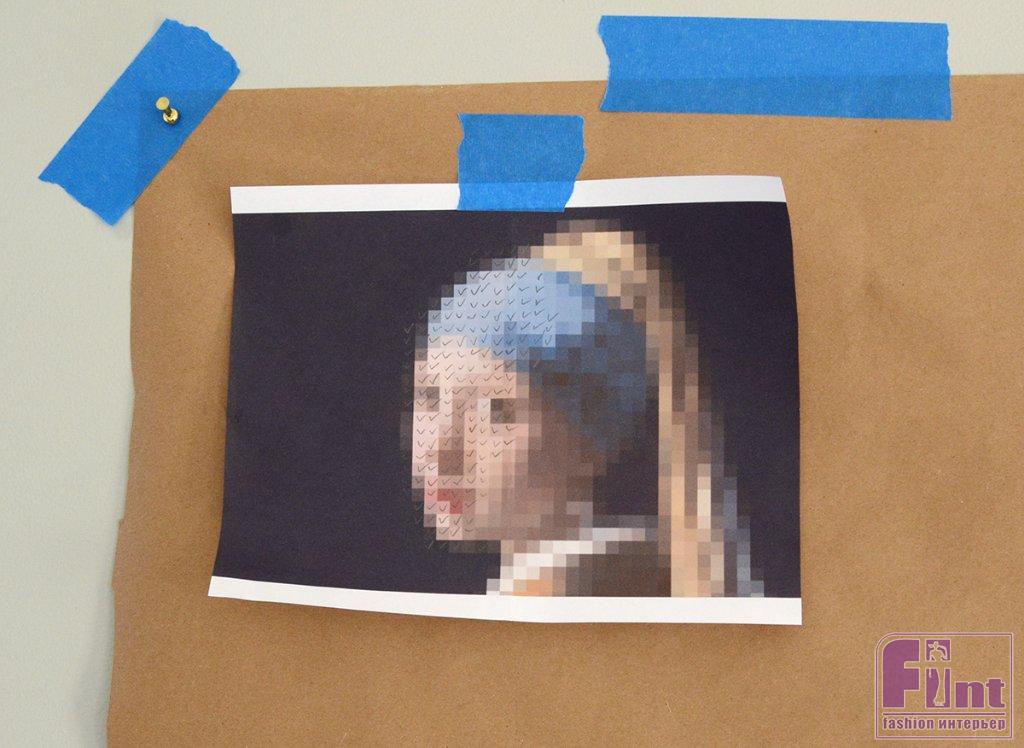 Начните с создания пиксельного рисунка. Вы можете использовать наше пиксельное изображение знаменитой картины, или создать собственное, используя Photoshop. Найдите в сети нужное вам изображение картины максимально большого размера и сохраните на компьютер. Откройте репродукцию в программе Photoshop, затем в меню «Фильтры» (Filter) выберите пикселизацию (Pixelate), а затем фильтр Mosaic. Мы установили свой мозаичный фильтр на 120, но вы можете варьировать размер пикселей. Чем больше будет пикселизирован рисунок, тем будет лучше, поскольку вам придётся использовать меньше цветных фрагментов для имитации пикселей. Затем распечатайте получившееся изображение его так, чтобы он поместился на стандартном листе бумаги формата А4.