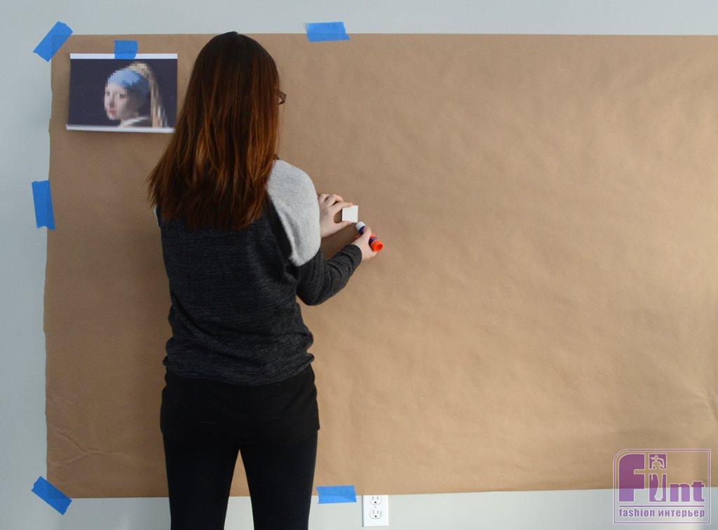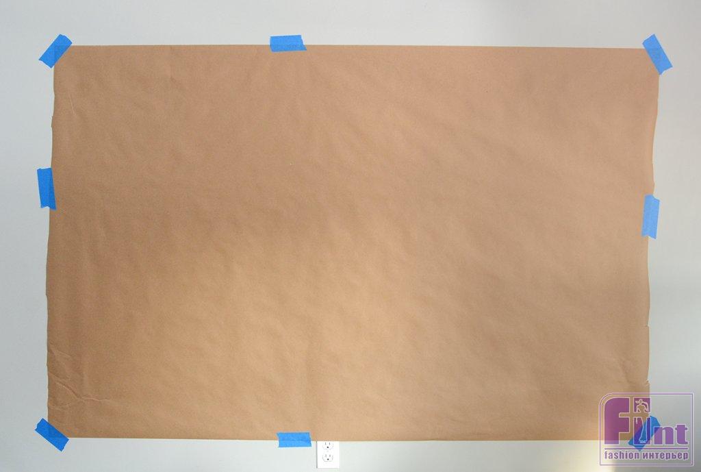 После проведения подготовительных работ с репродукцией картины можно приступать к украшению стены. Для начала закрепите большой лист крафт-бумаги на стене при помощи малярной клейкой ленты. Размер крафт-бумаги должен быть немного больше, чем итоговый рисунок, который вы хотели бы получить.