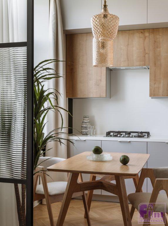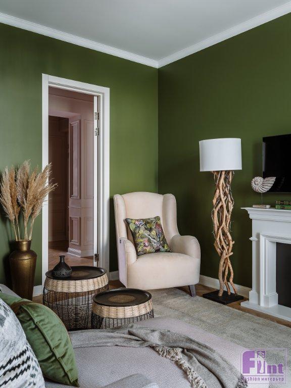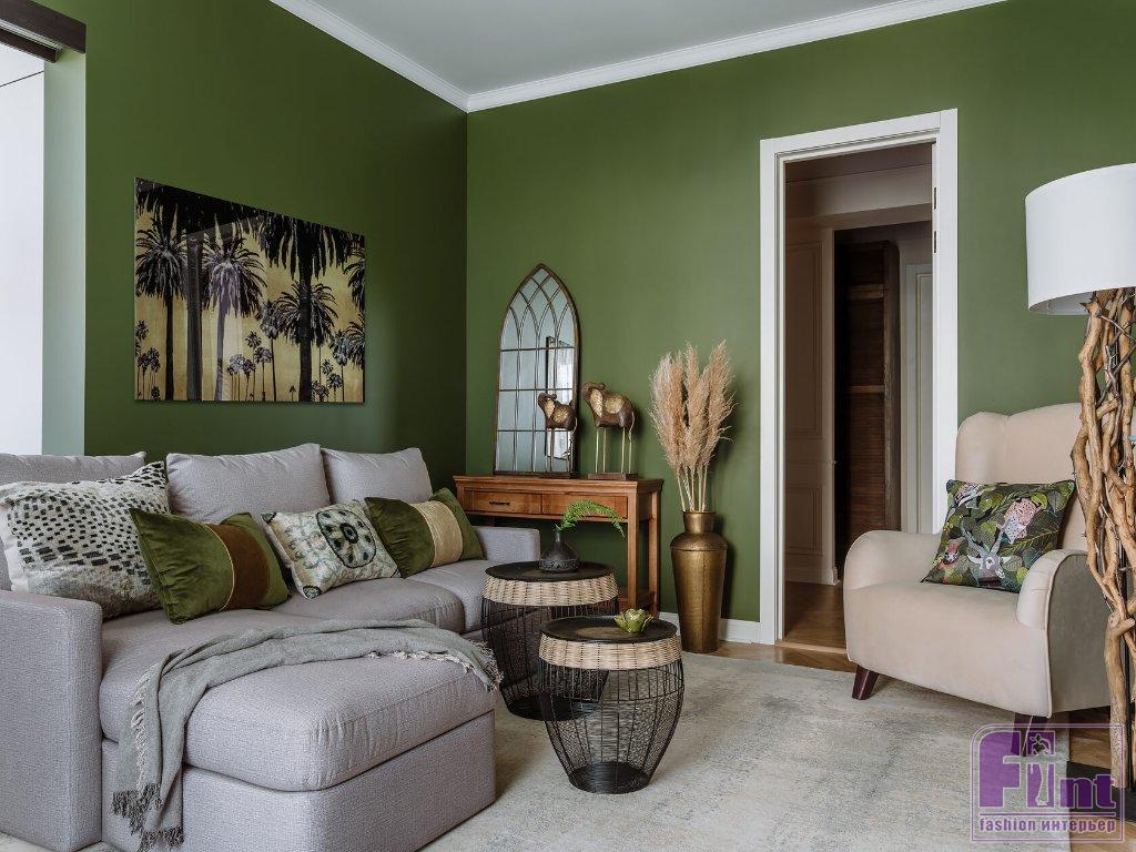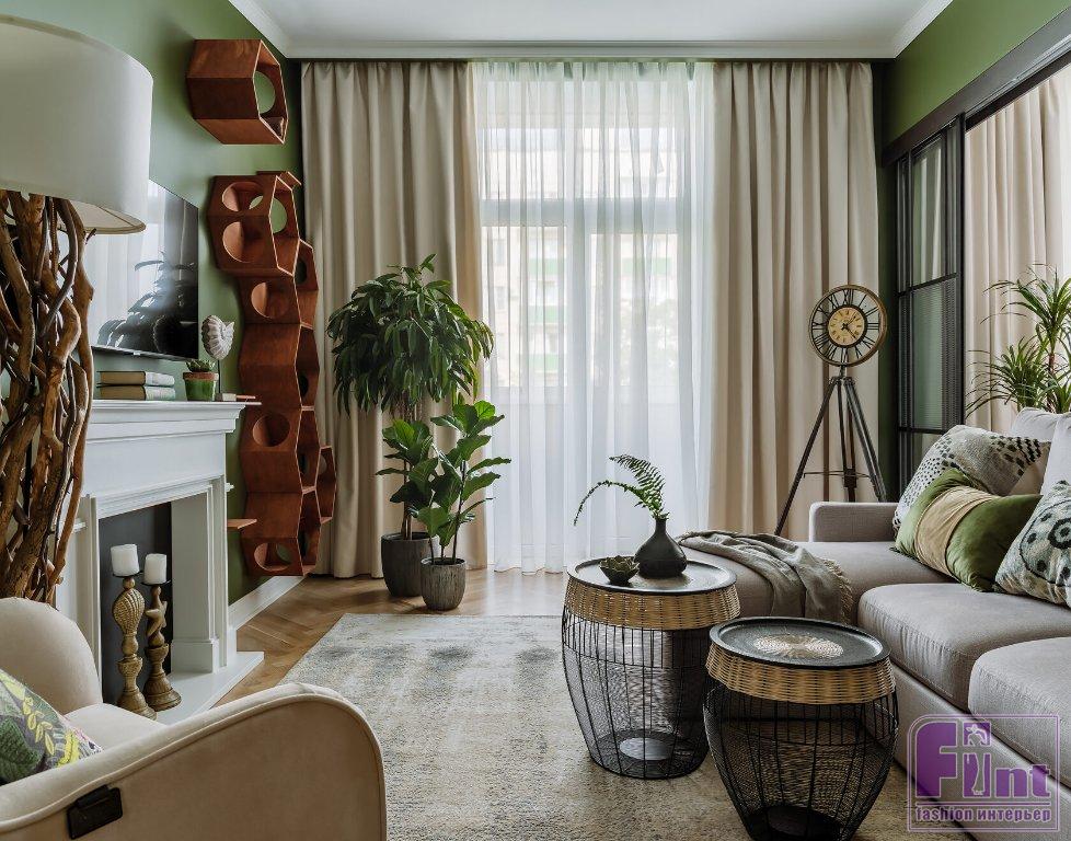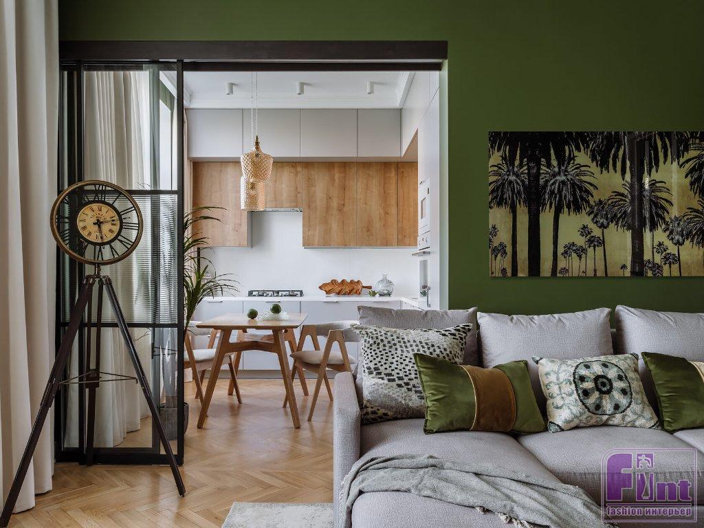 Интерьер гостиной напоминает джунгли, но не враждебные и опасные, а очень даже дружелюбные. На контрасте с гостиной кухня получилась очень спокойная и светлая. Два помещения разделяют раздвижные перегородки из стекла. По всей квартире для стен выбрали экологически чистую краску разных оттенков: от светлых до весьма насыщенных. Паркет в отличном состоянии достался от предыдущих хозяев, и его решили не менять.