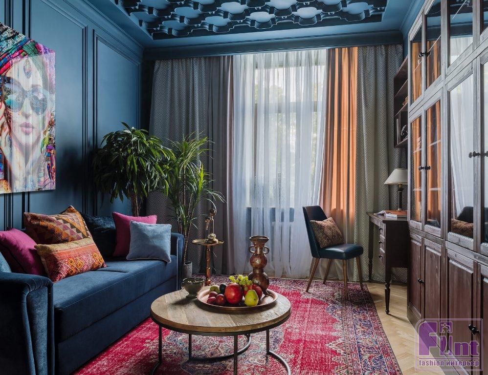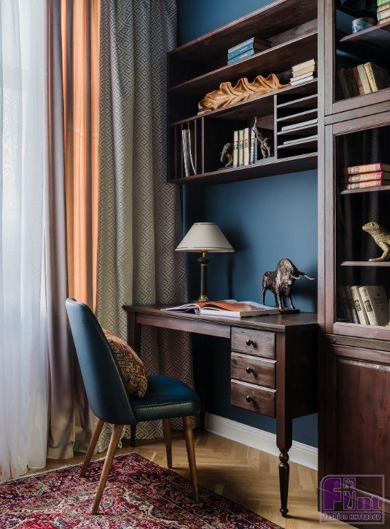 Кабинет получился самым насыщенным по цвету. Здесь в тёмный синий цвет выкрасили не только стены, но и потолок. Дополнительно его украсили лепниной с восточными мотивами. Атмосферу дополнили восточный постер, яркие подушки и ковер ручной работы. В такой обстановке заказчица и мечтала работать. Большая часть мебели, библиотека в кабинете, кровать выполнялись на заказ в столярной мастерской из разных пород дерева: дуб, ясень, сосна.