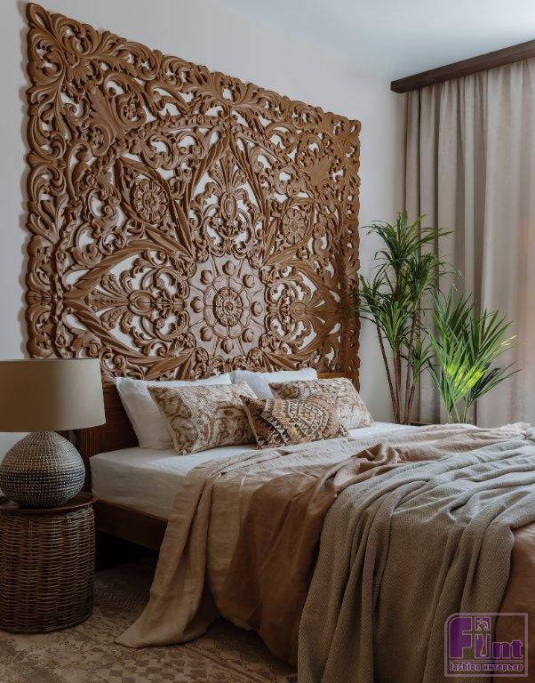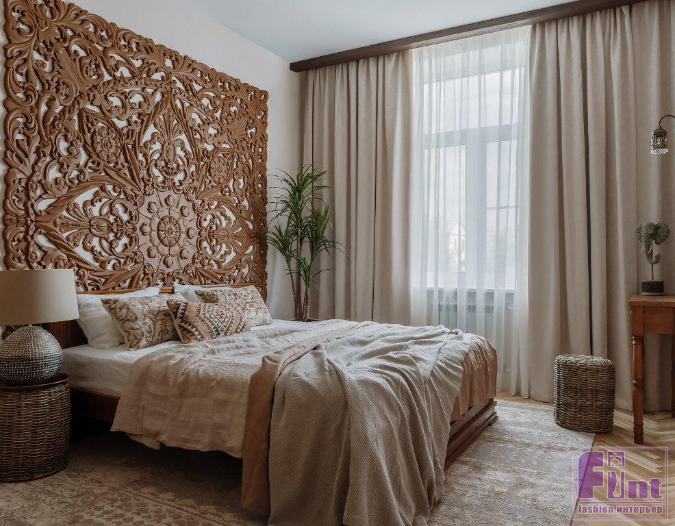В спальне резное изголовье выполнено глубокой фрезеровкой по МДФ. Напротив кровати на стене выполнена отделка единой фреской, её изготовили на заказ. В спальне предусмотрена полноценная гардеробная комната с фасадами из натурального ротанга, предназначенная для хранения одежды, для хозяйственных принадлежностей, обуви, чемоданов. Вся мебель изготавливалась на заказ. Получились эксклюзивные шкафы, разработанные специально под вкусы заказчицы.