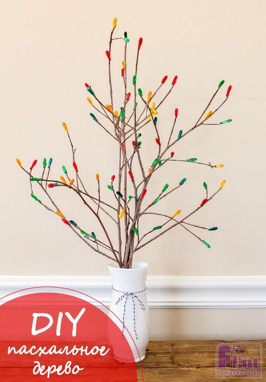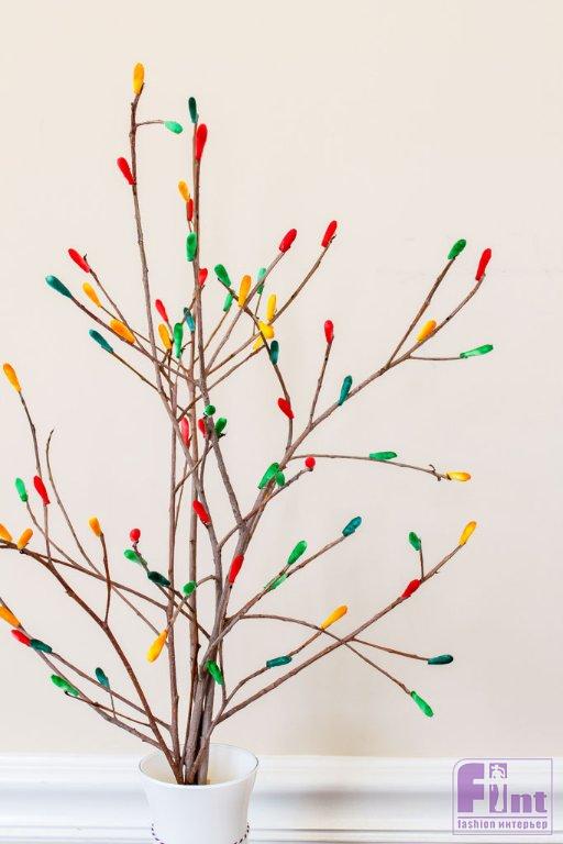 Наше прекрасное пасхальное дерево, сделанное своими руками, готово, чтобы украсить интерьер к светлому празднику Пасхи! Если немного пофантазировать, то получившиеся яркие почки на веточках из-за своей формы немного походят на крошечные цветные яйца, которые также являются обязательным атрибутом Пасхи во всём мире. Поставьте своё яркое пасхальное дерево, сделанное своими руками, в подходящую вазу и украсьте им свой дом! Светлого Христова Воскресенья!