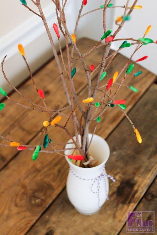 Пока ваши ватные палочки сохнут, немного прогуляйтесь вокруг дома, чтобы подыскать несколько красивых веток для вашей вазы. Мы решили дополнительно не декорировать веточки, оставив их в натуральном естественном виде. Вы можете также покрасить веточки белой краской, на фоне которой яркие почки будут выглядеть ещё более выразительно.