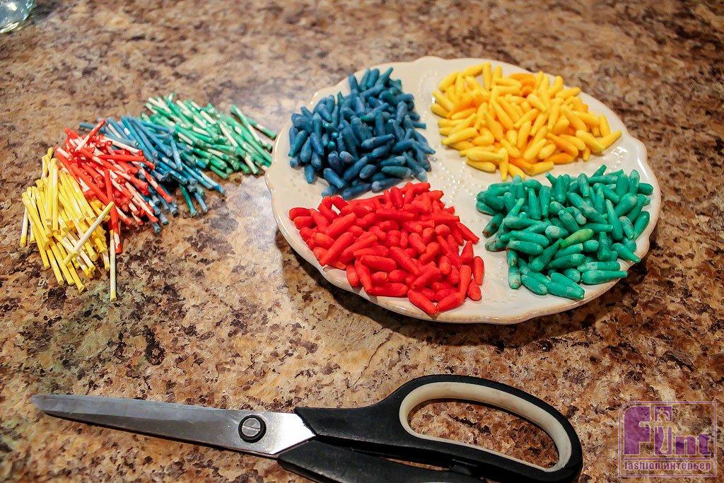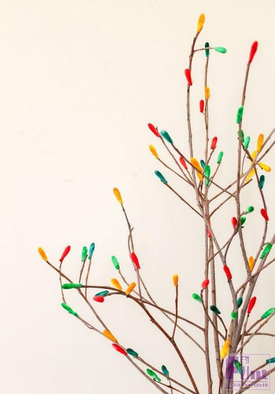 Как только ватные палочки высохнут, срежьте все ватные кончики по границе, на которой заканчивается вата. Затем, используя клеевой пистолет, приклейте горячим клеем получившиеся цветные «почки» на веточки, чередуя цвета и распределяя почки по всей длине веточек.