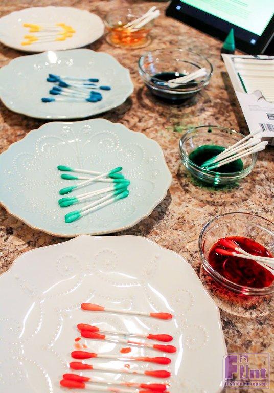Затем обмакните каждый конец ваших ватных палочек в раствор с пищевым красителем и дайте им высохнуть. В процессе высыхания раствор с красителем может покрыть ватные палочки неравномерно. В этом случае повторите окрашивание, чтобы добиться яркого и сочного оттенка ваты, намотанной на концы палочек.