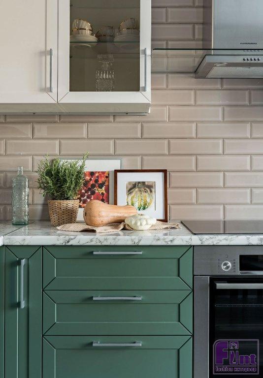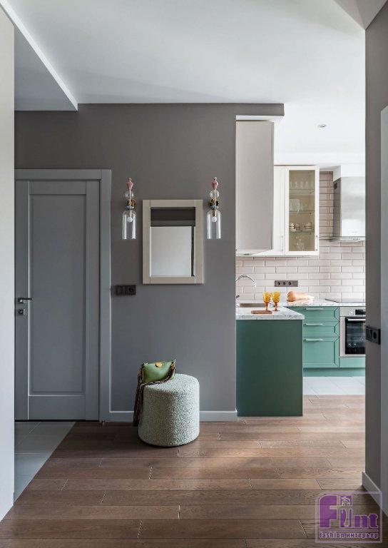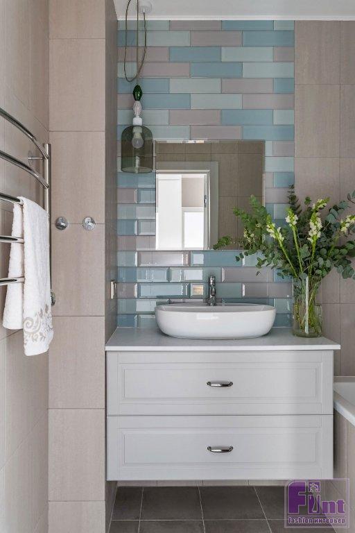 Пол в прихожей выделили серой плиткой. Также плитку использовали в отделке ванной комнаты и санузла. Выбрали нейтральные цвета и простые формы, но в ванной сделали акцент на зоне раковины, используя популярную среди дизайнеров плитку «metro» в трёх разных пастельных оттенках. Такая же плитка в серо-бежевом цвете уложена в зоне кухонного фартука.