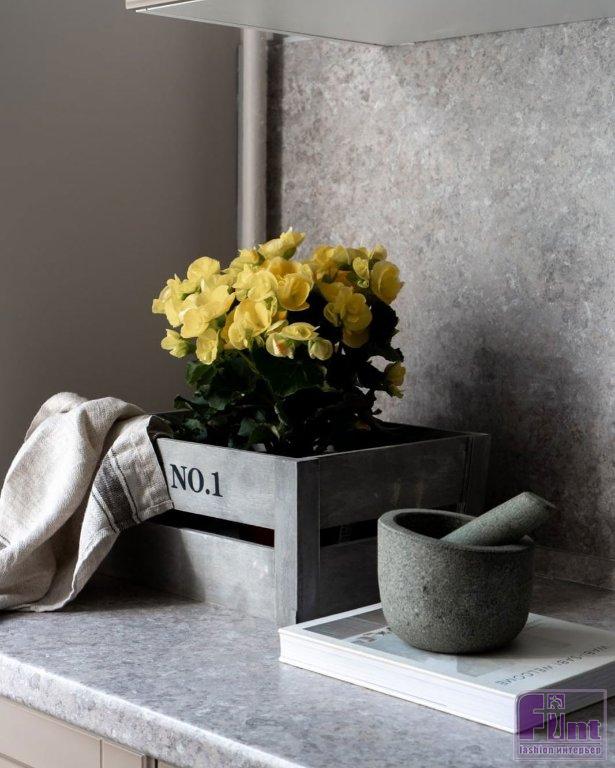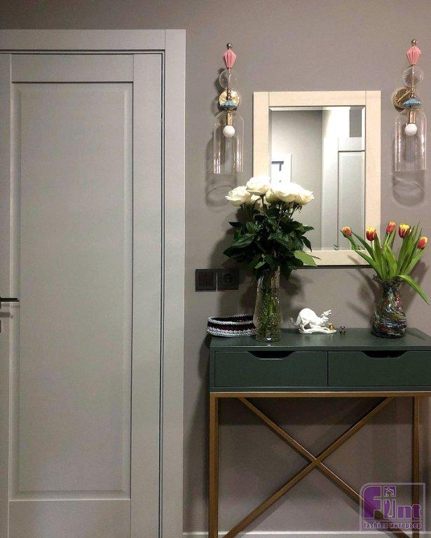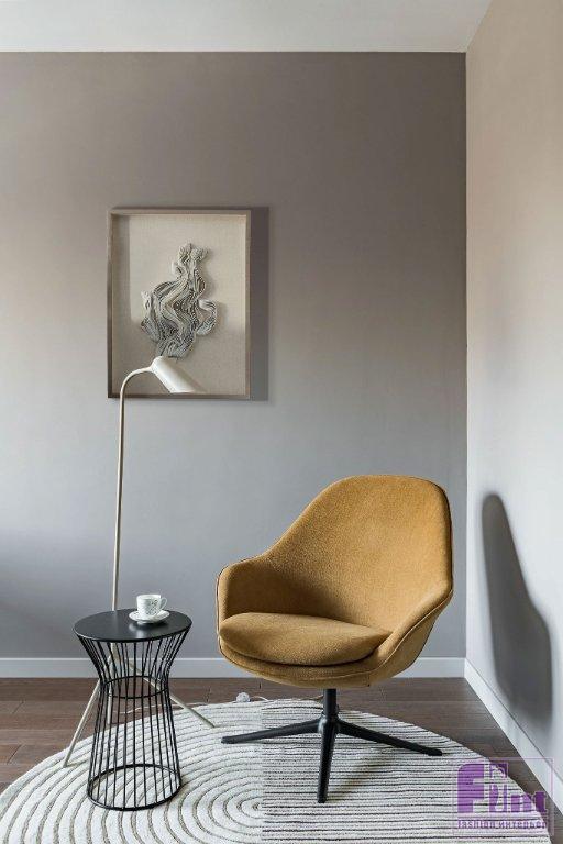Кроме этого, пожеланием заказчицы была сдержанная цветовая палитра, но в тоже время ей хотелось ярких элементов. Поэтому при разработке гаммы за основу взяли серый цвет, которым выкрашены все стены. В качестве дополнительных цветов использовали оттенки зелёного, пудрового цвета и глубокие оттенки серого. В детской добавили контрастных цветов: красный, черный и цвет горчицы, которые присутствуют в мебели, предметах освещения и текстиле.