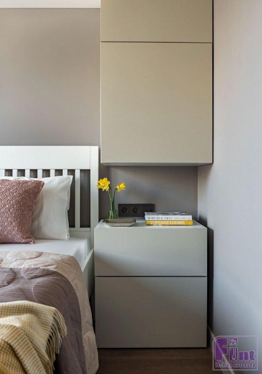 В детской встроили шкафы по двум сторонам от окна: в одном скомбинированы полки за стеклом и глухими дверцами, а второй представляет собой открытый стеллаж. Такое решение также способствовало оптимизации пространства в комнате. Оконный подоконник расширили, превратив в диванчик. Это стало местом отдыха ребенка и важным элементом зонирования детской. В ванной комнате хранение представлено тумбой под раковину, а в санузле в колонне со стиральной и сушильной машинами оставили полки для бытовой химии.